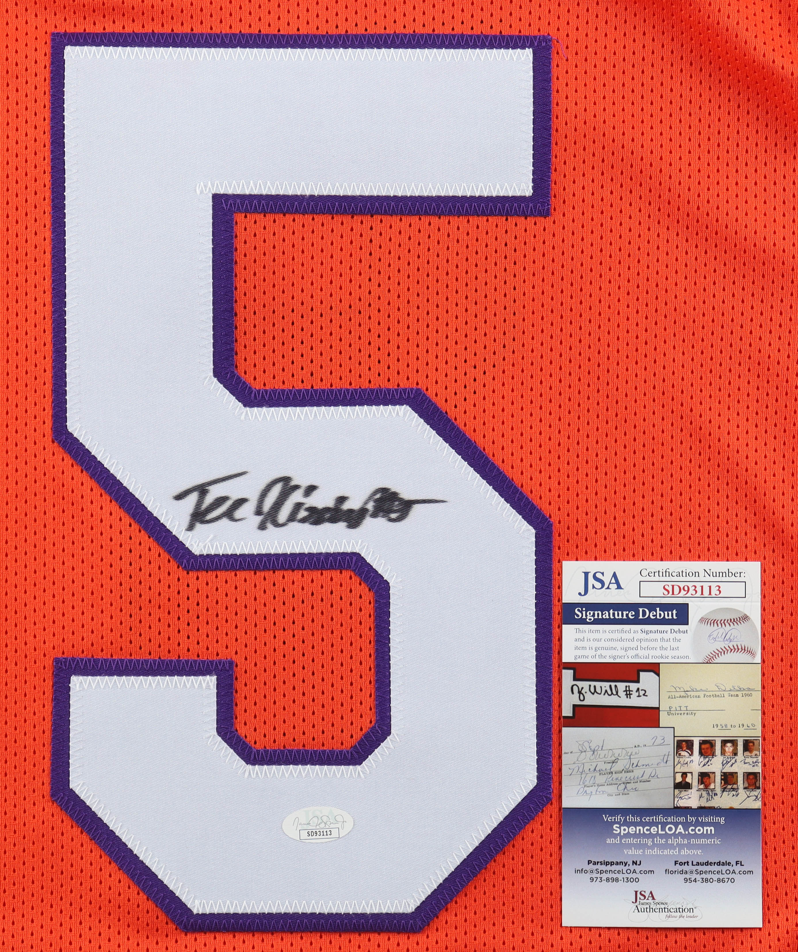 The autograph(s) includes an official James Spence Authentication (JSA) "Signature Debut" hologram and COA. "Signature Debut" is the autographed memorabilia equivalent to a rookie card. The JSA definition of a "Signature Debut" is as follows: "Any item that is autographed and received by JSA prior to the last game of the signer's official rookie season.