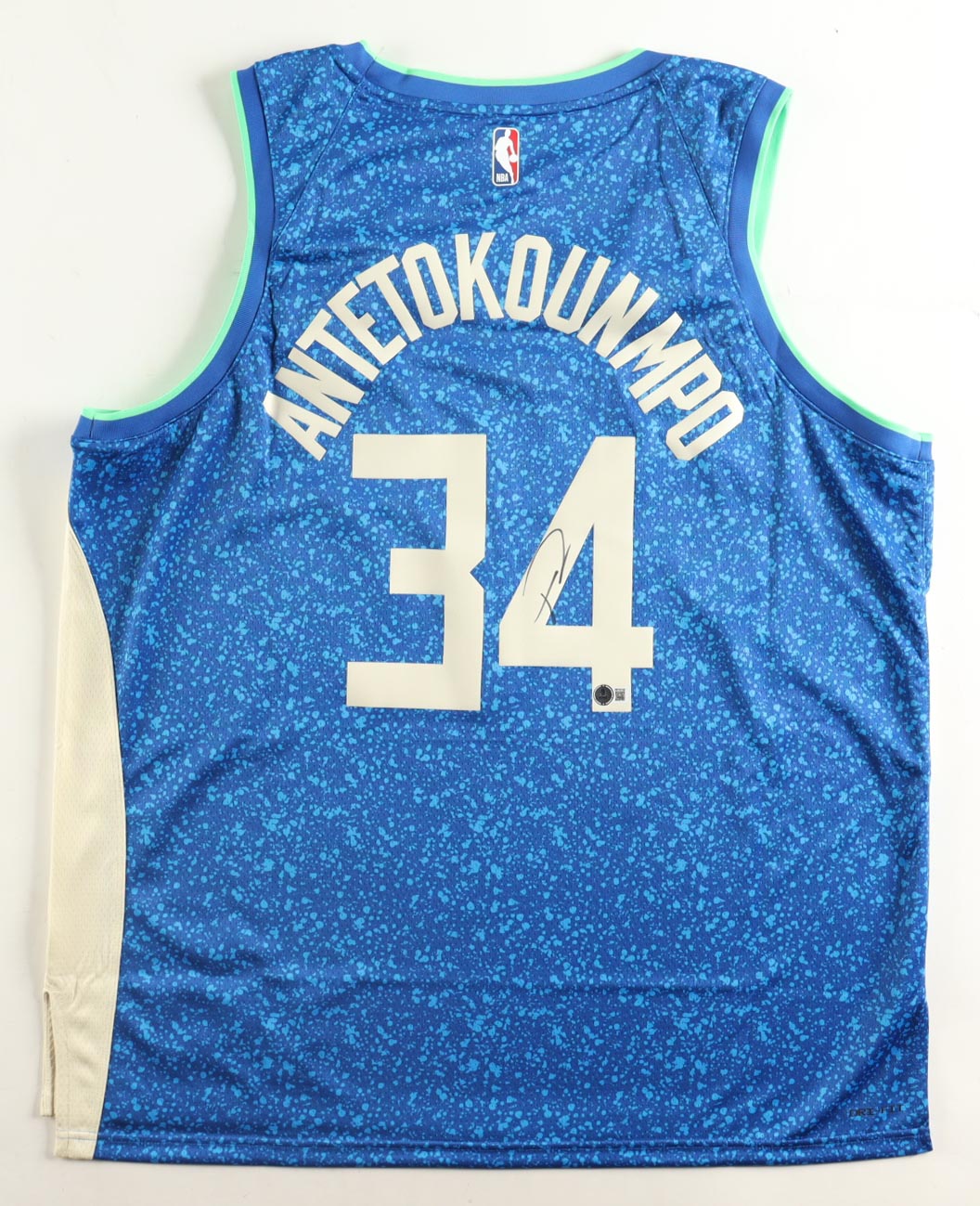 Nike authentic jersey with everything pressed on, size XXL. Hand-signed by Giannis Antetokounmpo (Milwaukee Bucks).