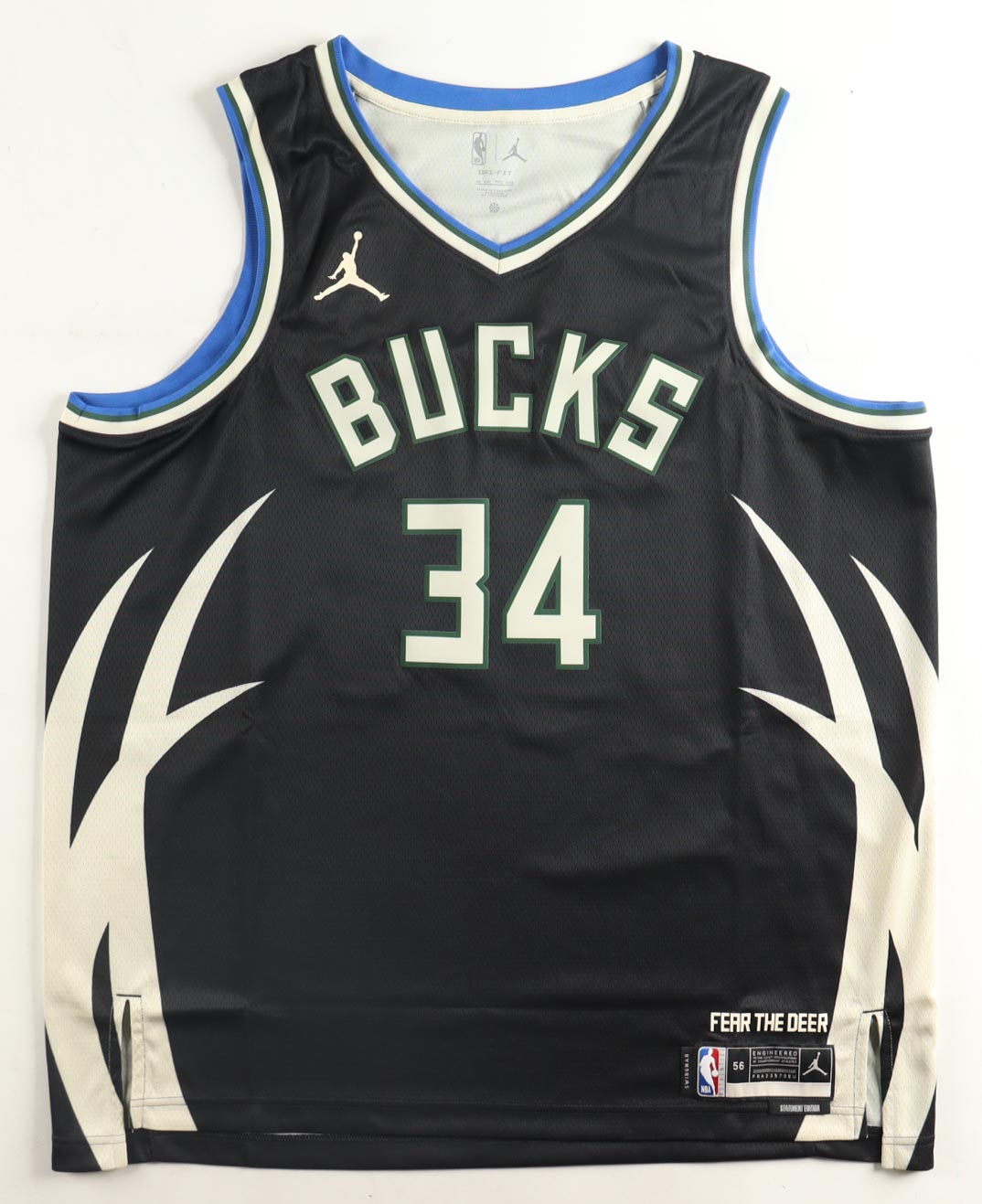 Jordan authentic jersey with everything pressed on, size XXL. Hand-signed by Giannis Antetokounmpo (Milwaukee Bucks).