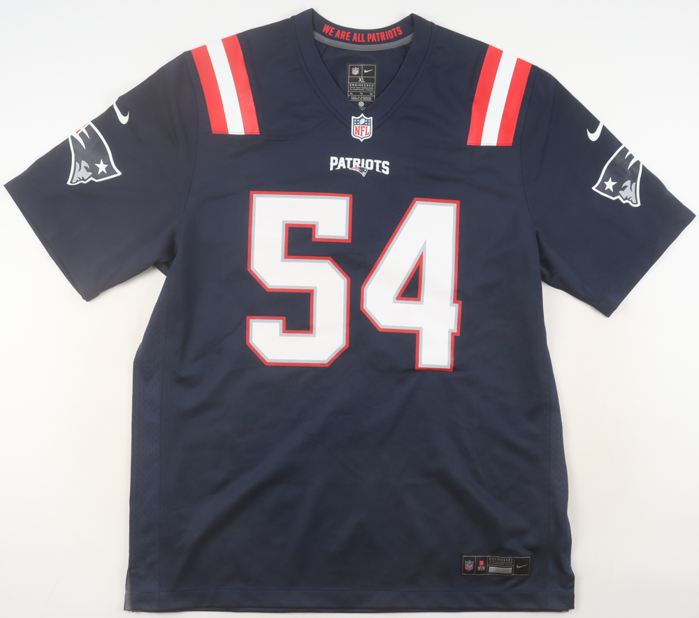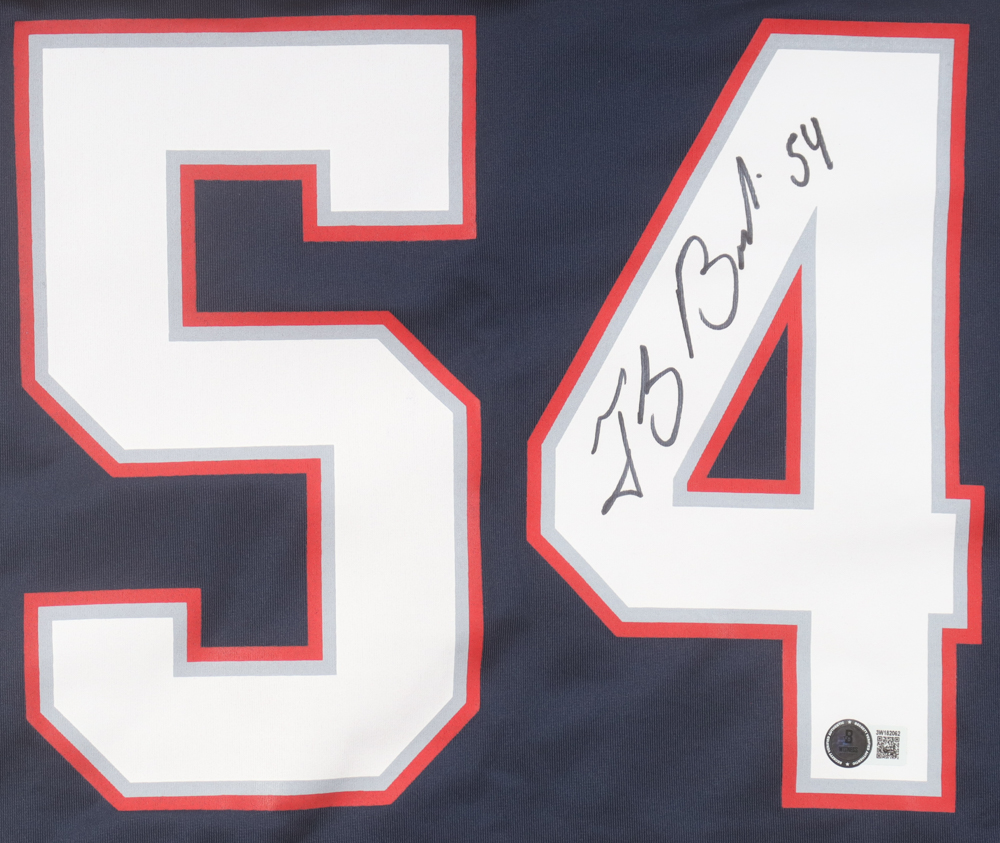 Nike authentic jersey with everything sewn on, size XL. Hand-signed by Tedy Bruschi (New England Patriots).
