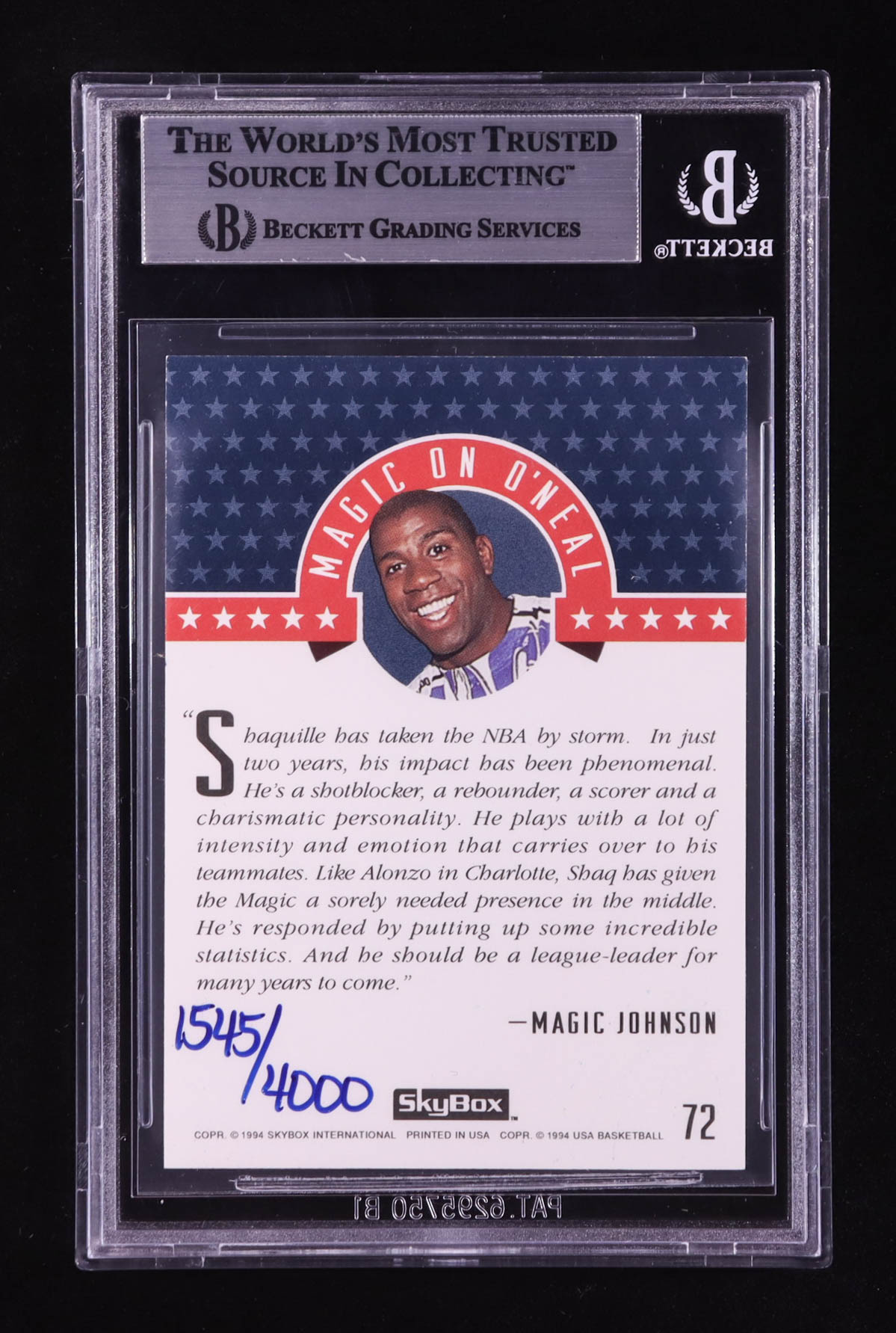 Shaquille O'Neal Signed LE 1994 SkyBox USA #72 Magic On (BGS)