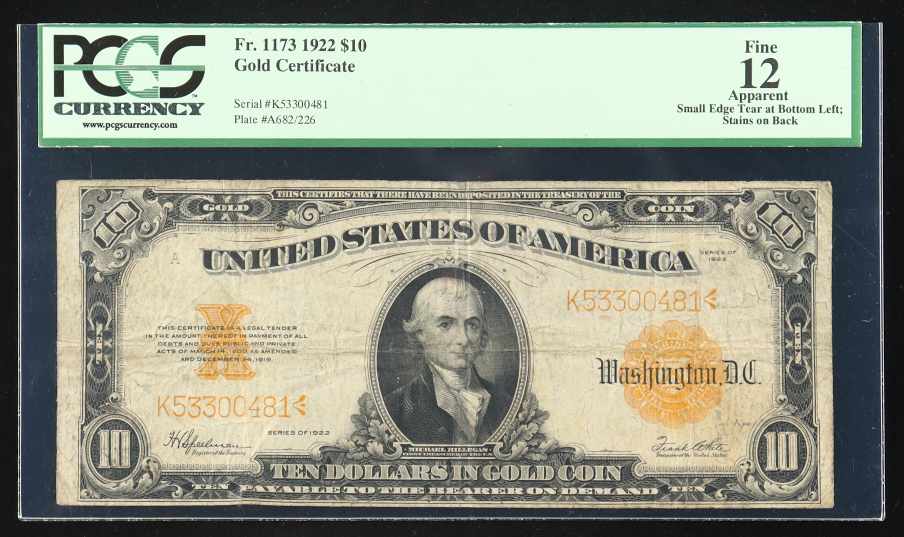 1922 $10 Ten Dollars Gold Certificate (PCGS Fine 12)