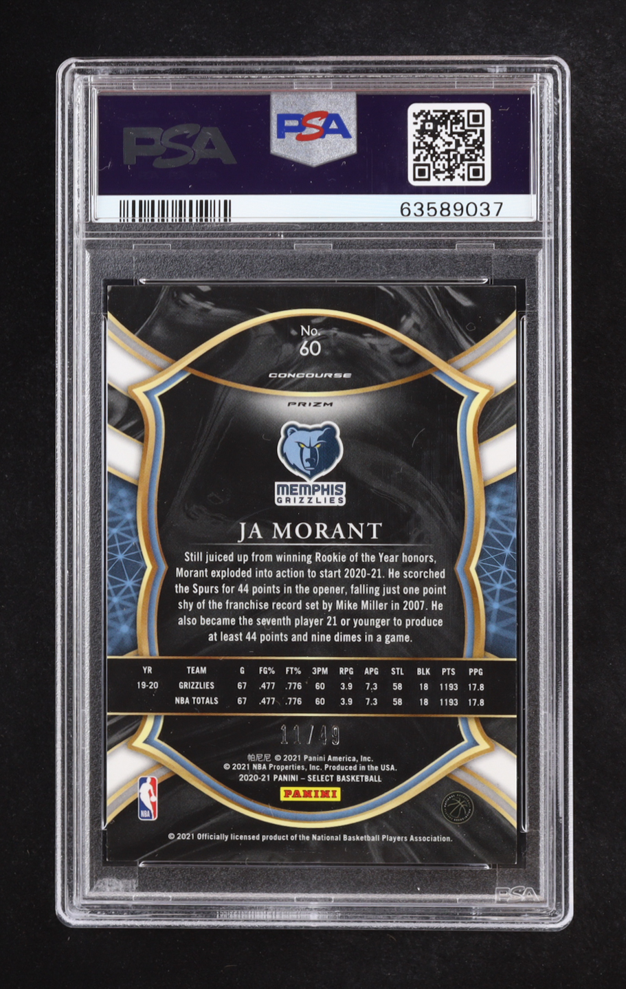 Ja Morant 2020-21 Select Prizms Red Disco #60 #11/49 (PSA 9)