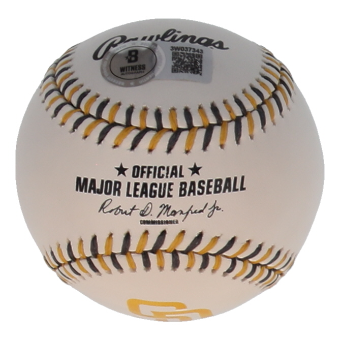 Rawlings Official Major League San Diego Padres logo baseball. Hand-signed by Jackson Merrill.