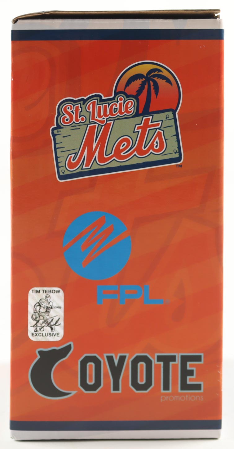 Coyote Promotions St. Lucie Mets bobblehead measures 6" tall. Hand-signed on the packaging by Tim Tebow.