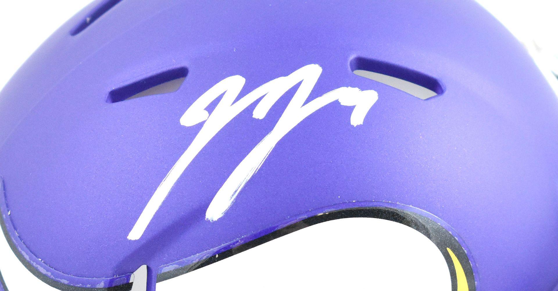 Riddell Minnesota Vikings speed mini helmet has been hand-signed by JJ McCarthy.