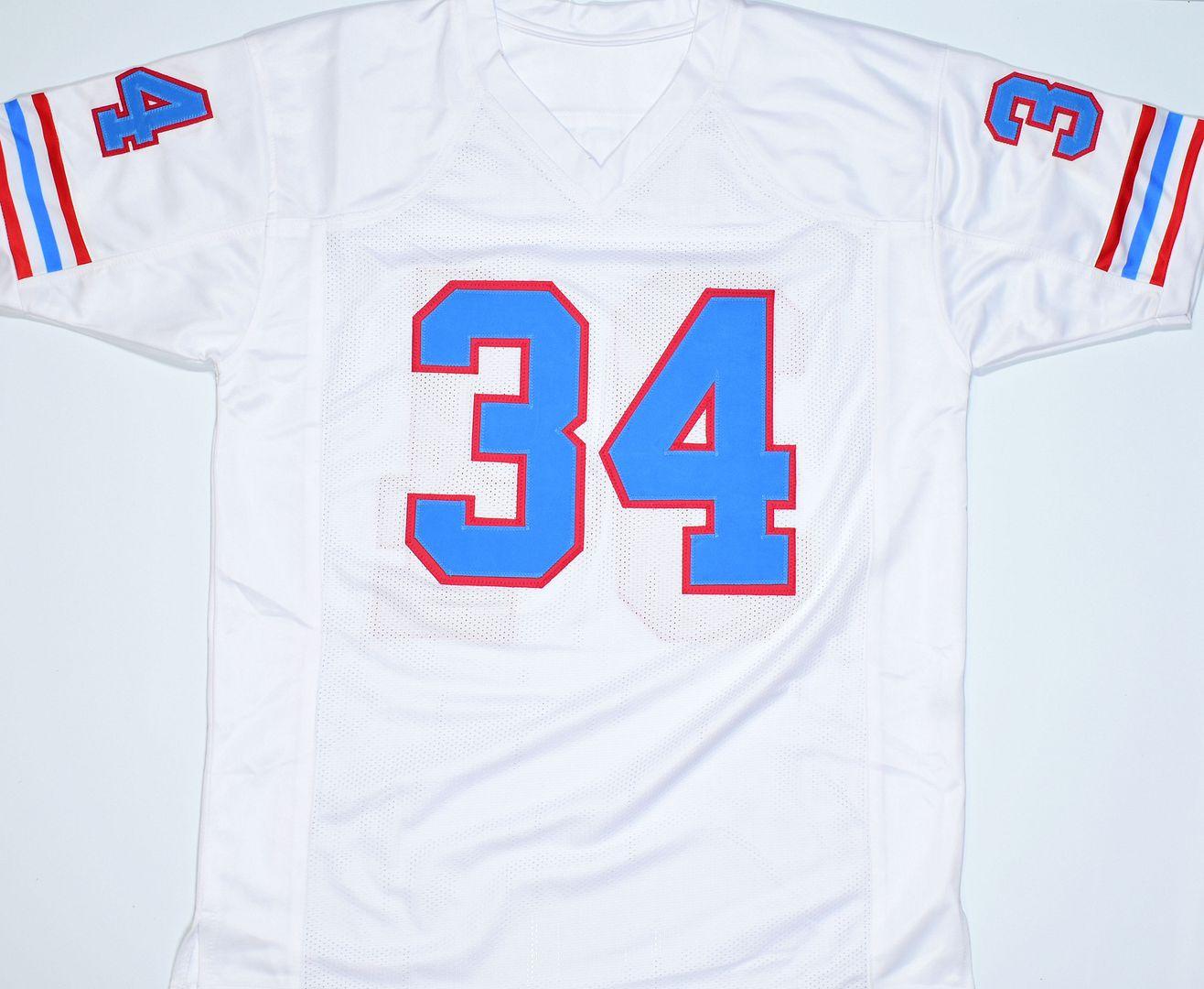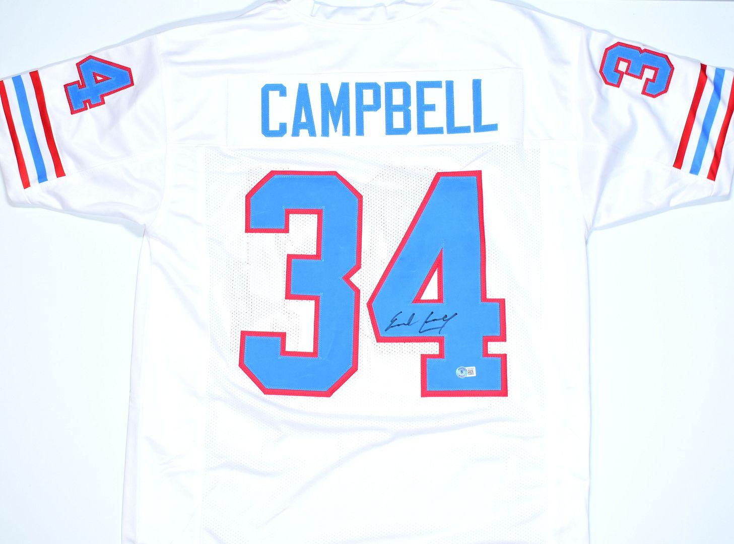 Custom jersey with everything sewn on, size XL. Hand-signed by Earl Campbell (HOF).