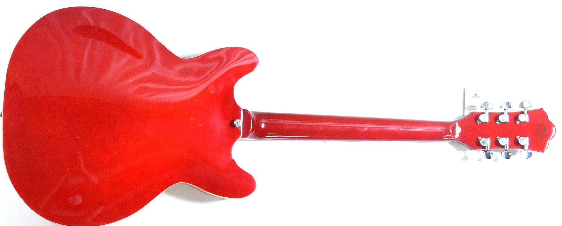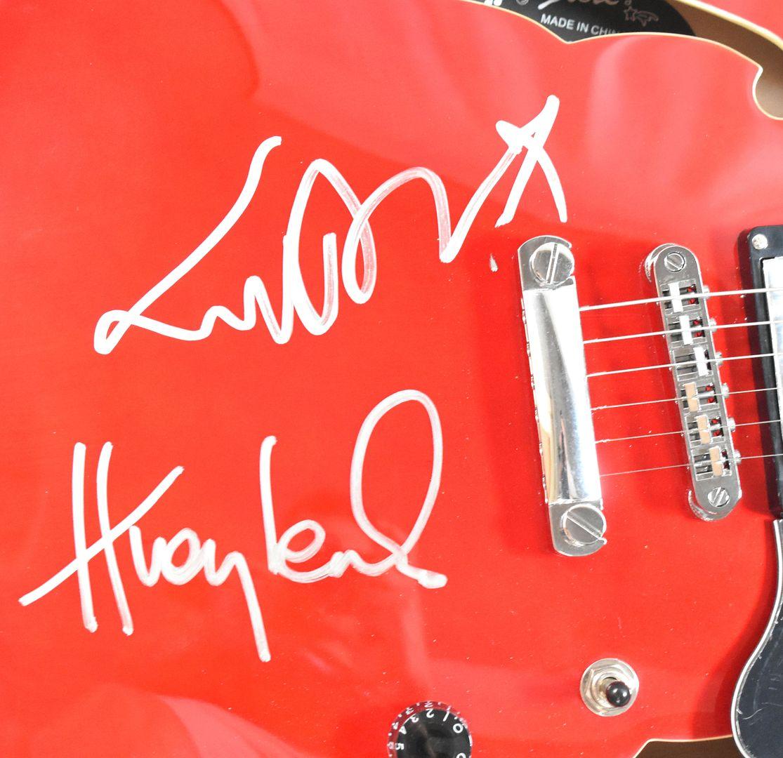 Fender Squire Starcaster electric guitar measures approximately 40" in length and has been hand-signed on the body of the guitar by Michael J. Fox and Huey Lewis.