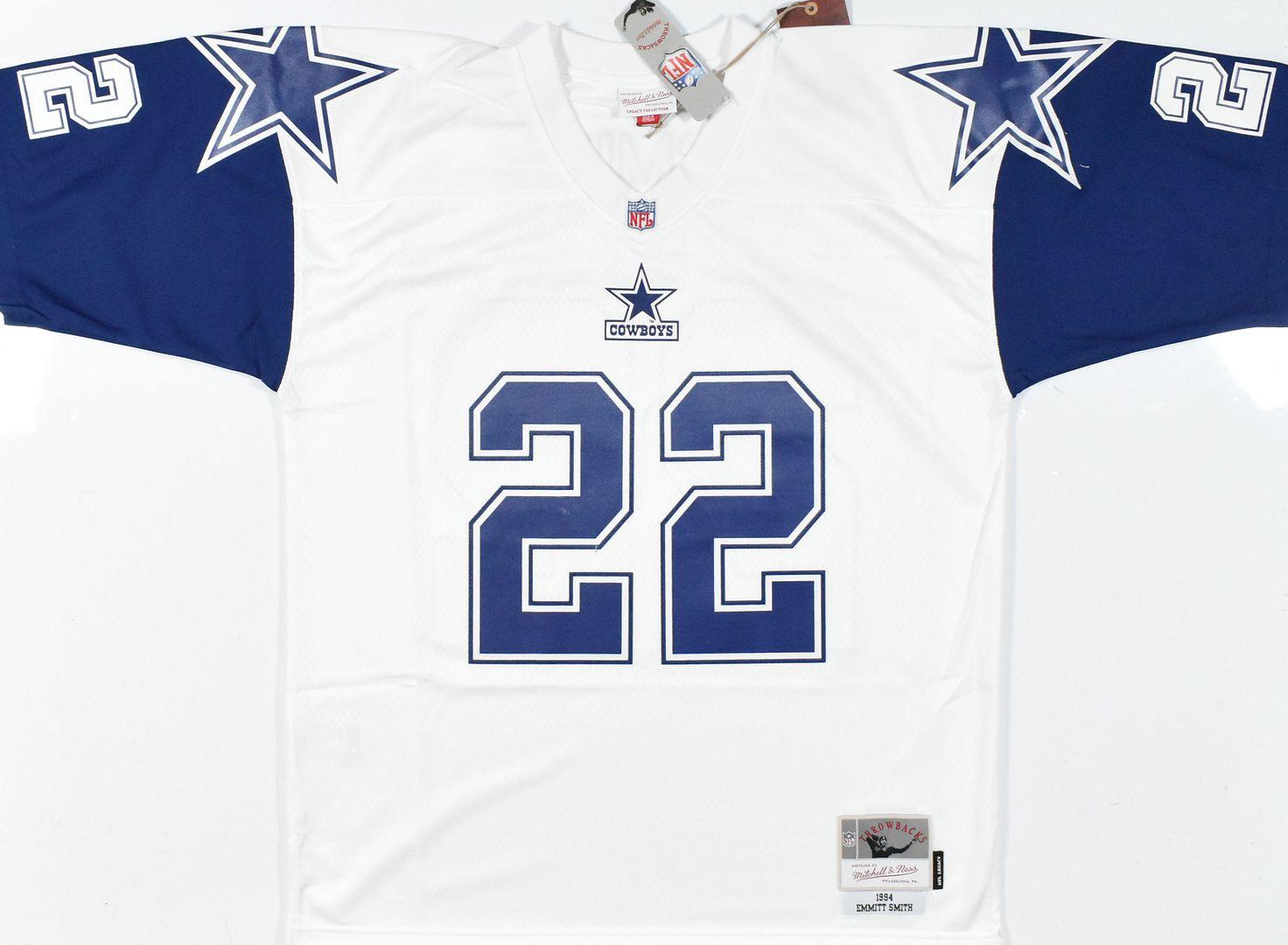 Mitchell & Ness jersey with everything sewn on, size XL. Hand-signed by Emmitt Smith (Dallas Cowboys, HOF).
