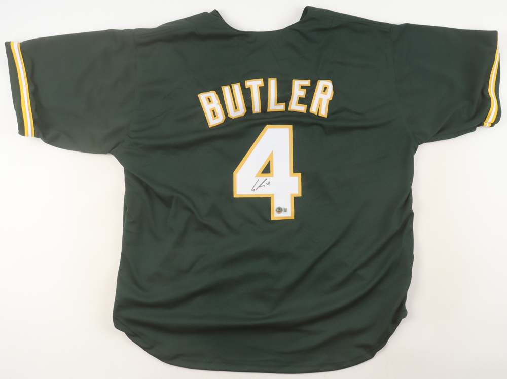 Custom jersey with everything sewn on, size XL. Hand-signed by Lawrence Butler (Oakland Athletics).