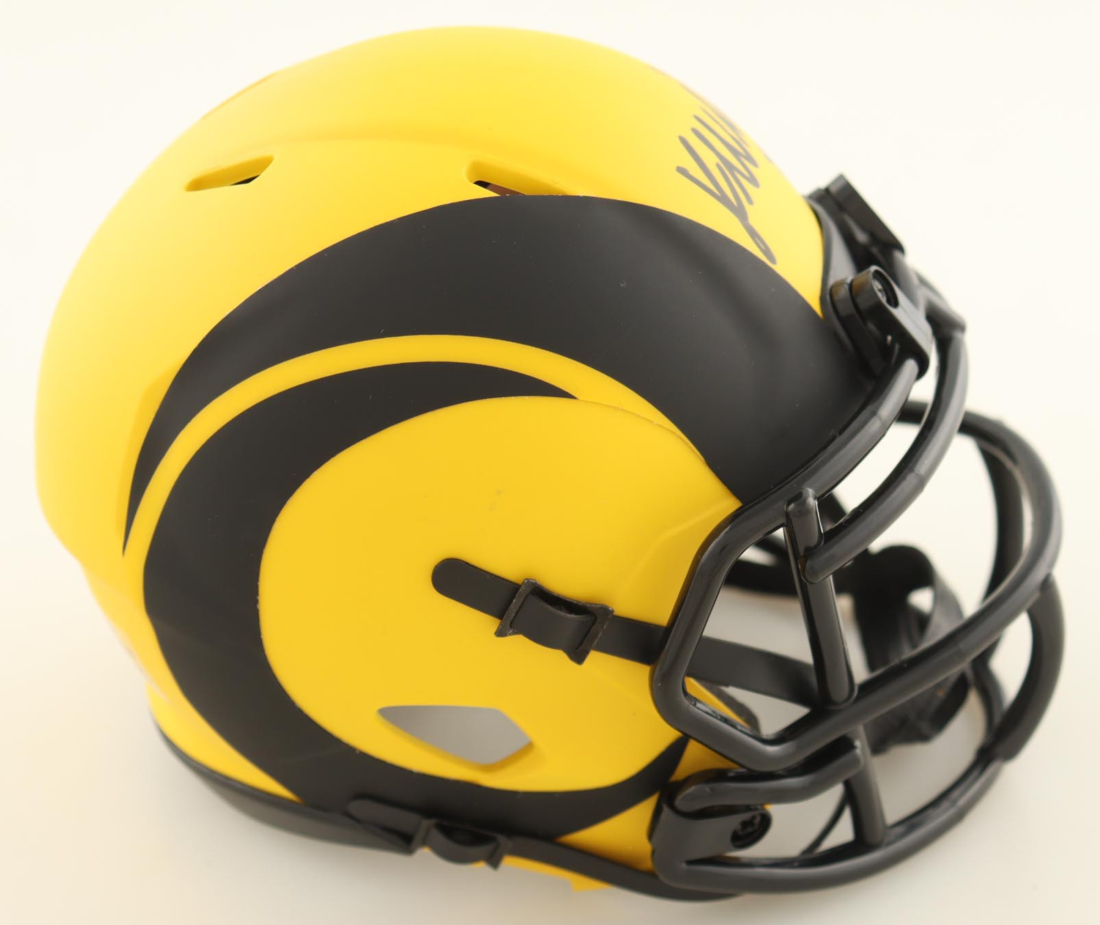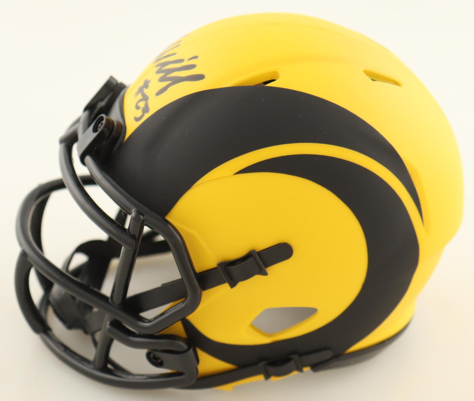 Riddell Los Angeles Rams Rave Alternate Speed mini helmet. Hand-signed by Kyren Williams.