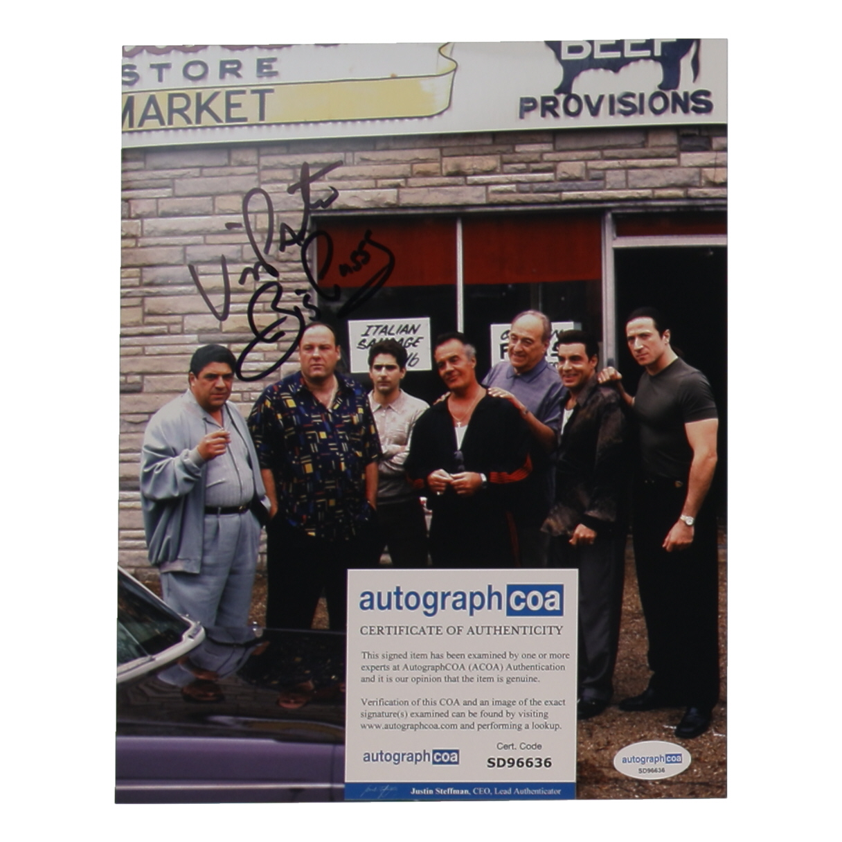 Photo measures 8" x 10" in size and has been hand-signed and inscribed by Vincent Pastore.