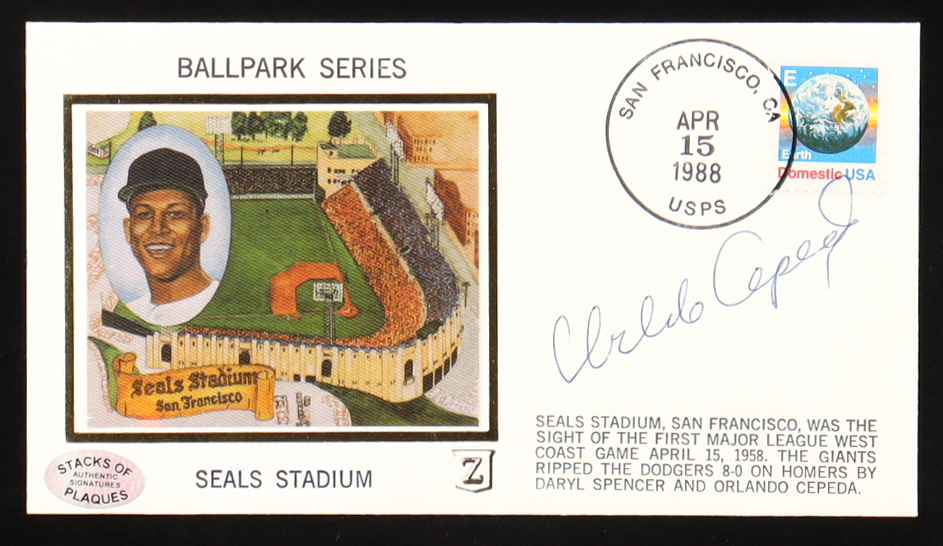First Day Cover Cachet envelope postmarked April 15, 1988 has been hand-signed by Orlando Cepeda (San Francisco Giants, HOF).