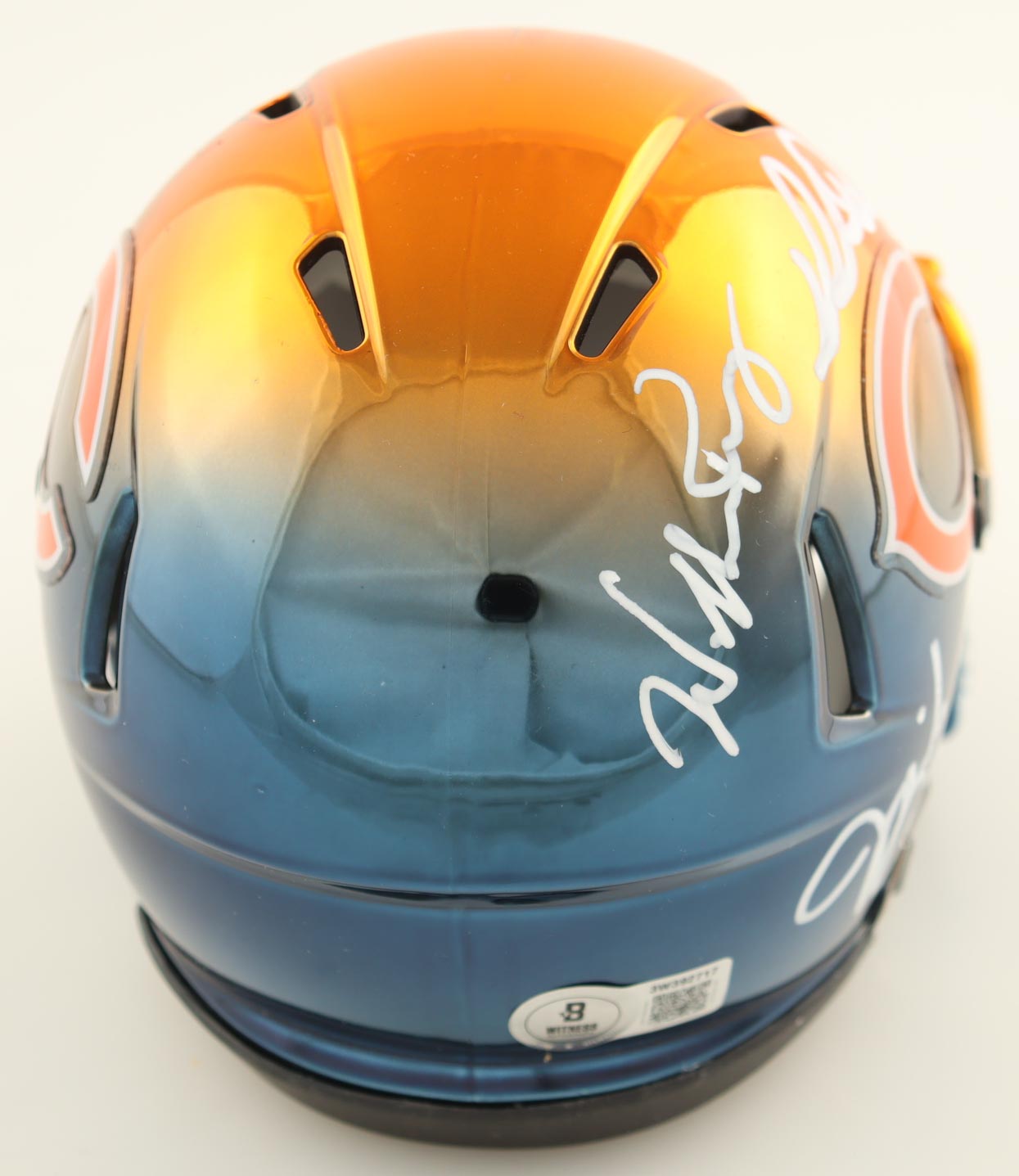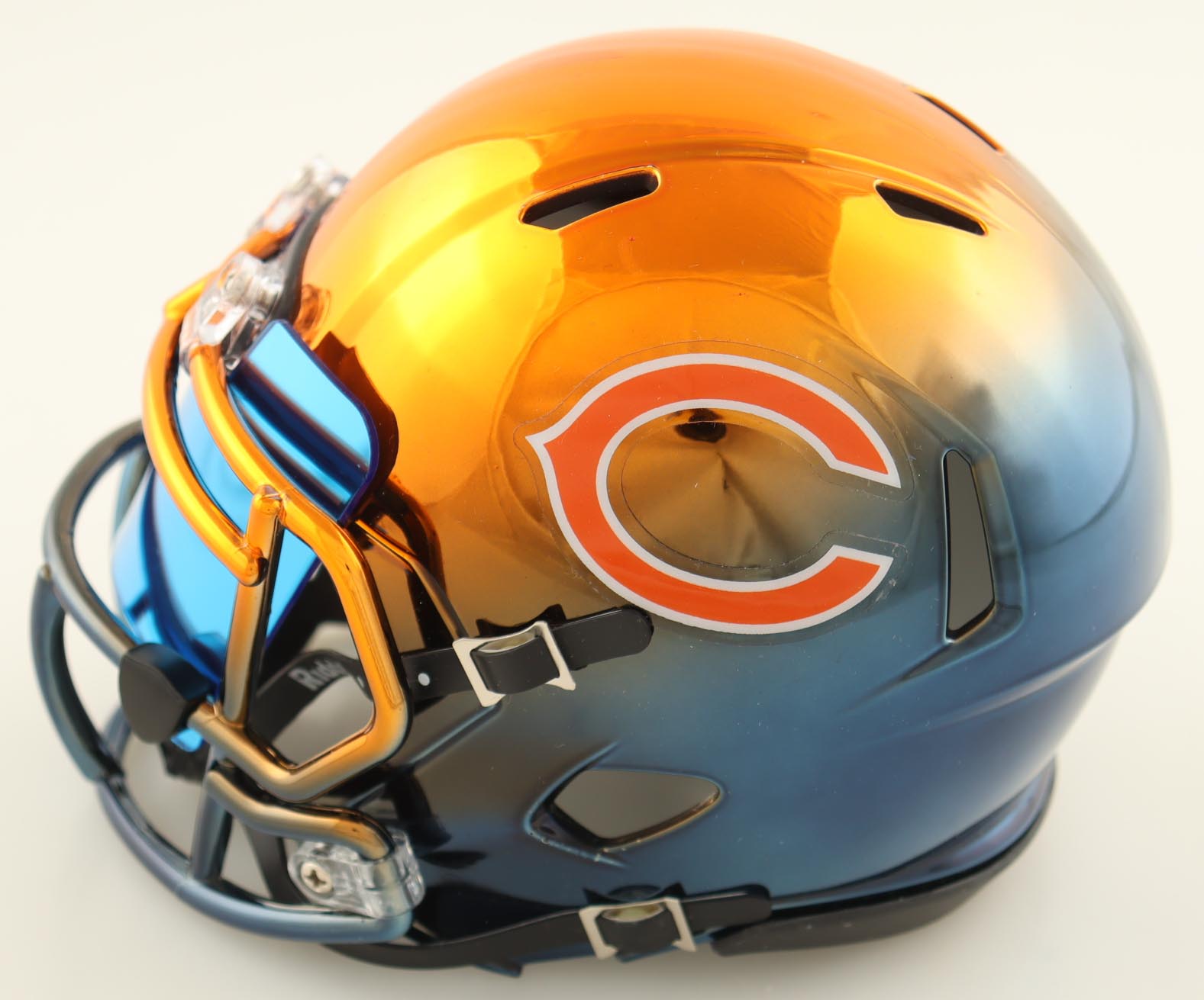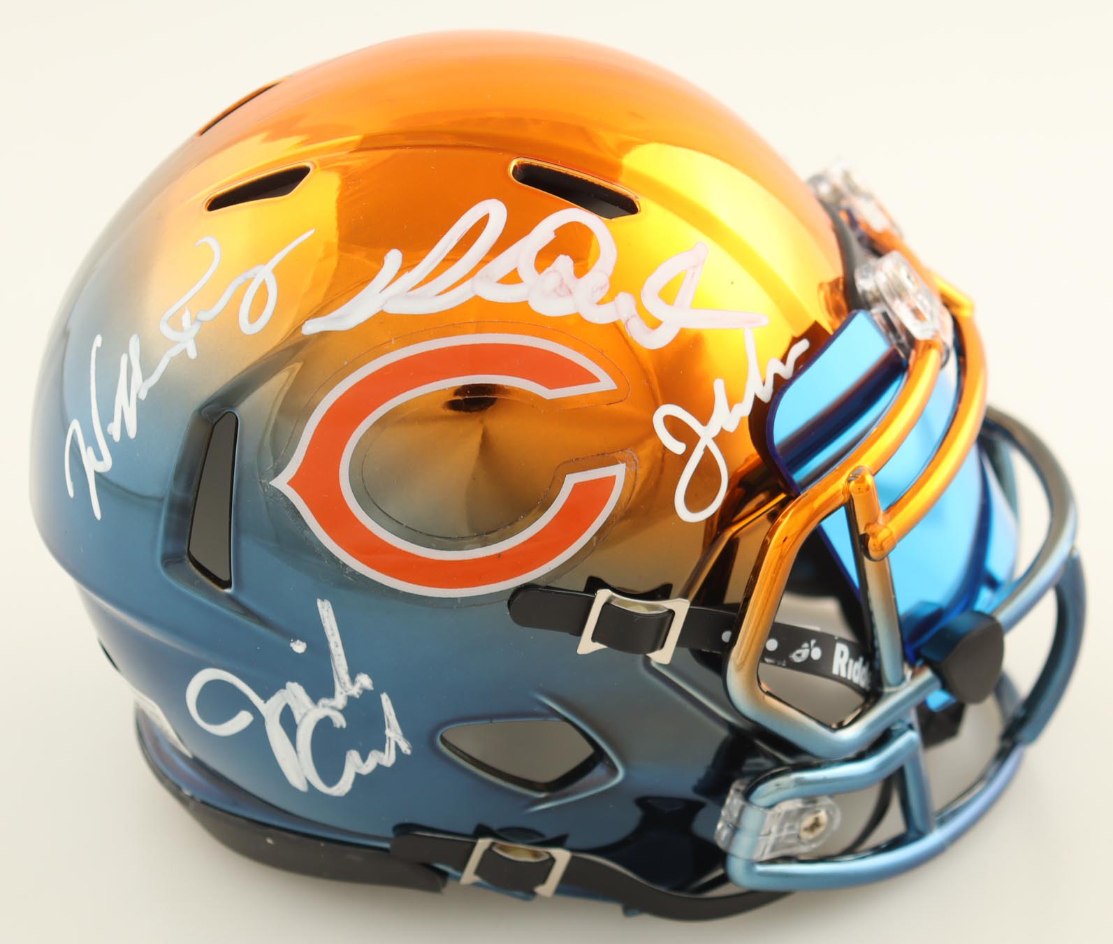 Riddell Chicago Bears custom chrome Speed mini helmet has been team-signed by (4) members of the 1985 Super Bowl championship team including Richard Dent (HOF), Jim McMahon, Jim Covert (HOF), and William Perry.