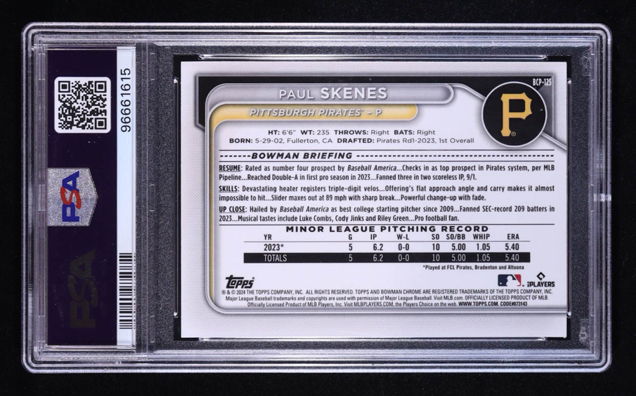 Paul Skenes 2024 Bowman Chrome Prospects Lunar Glow Refractors #BCP125 RC (PSA 10)