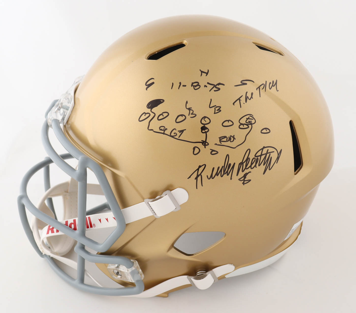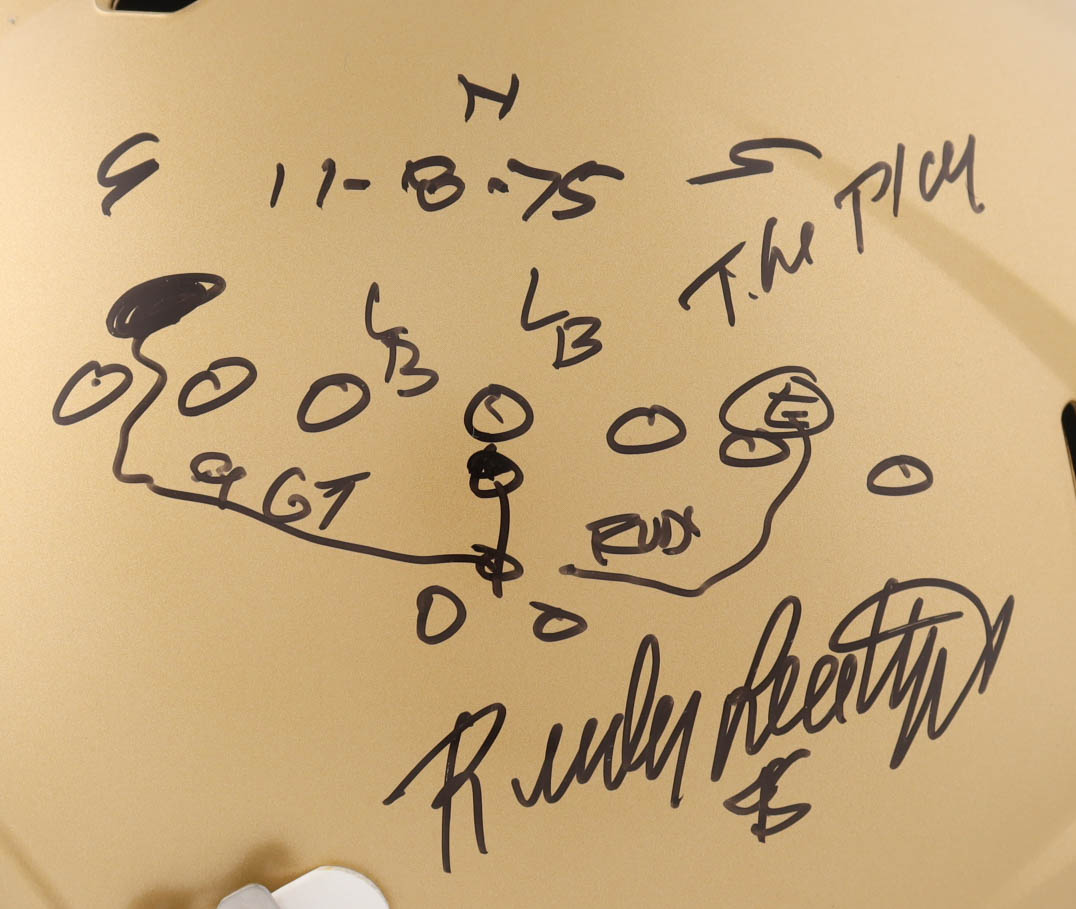 Riddell Notre Dame Fighting Irish full-size replica helmet has been hand-signed and inscribed by Rudy Ruettiger.
