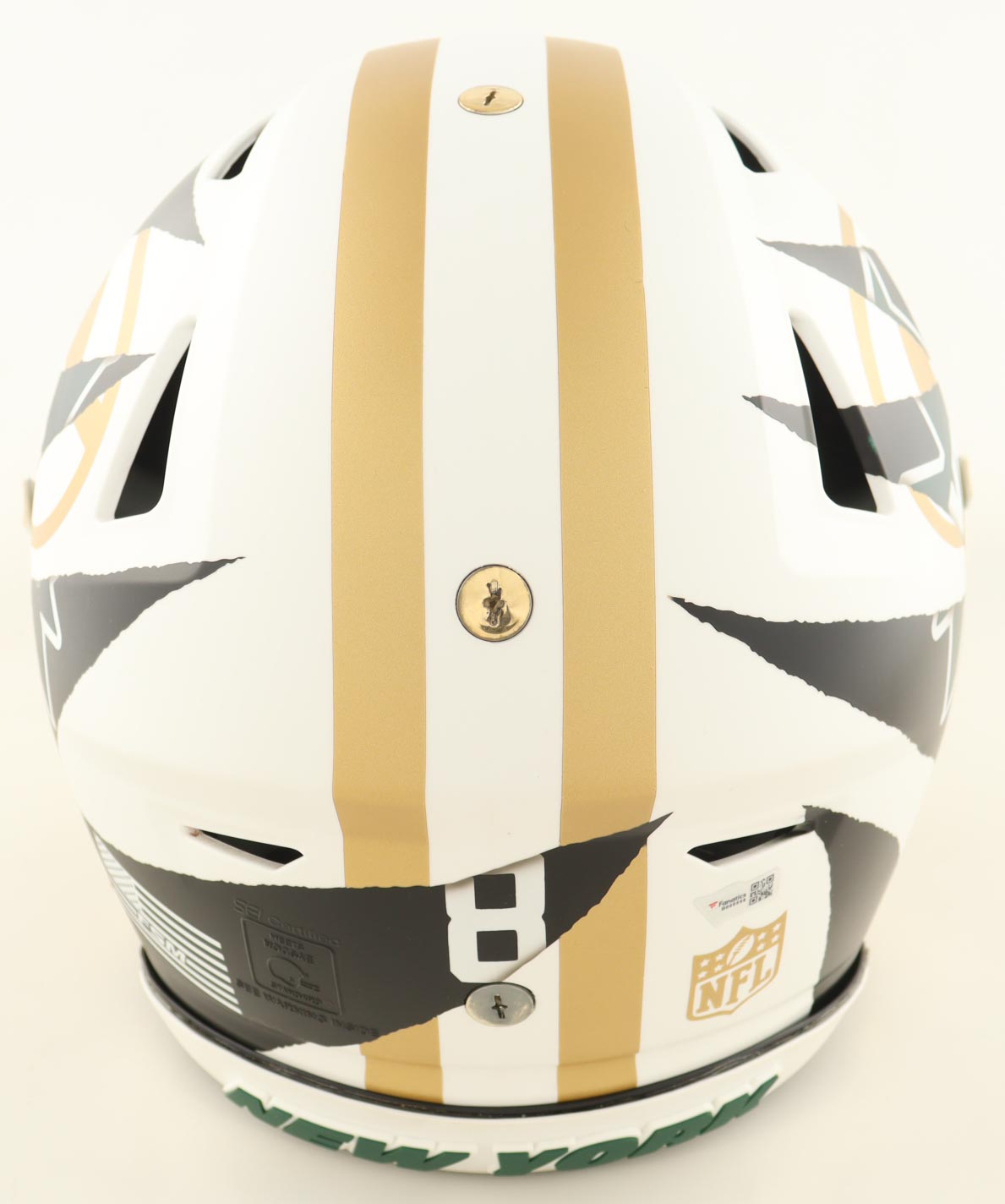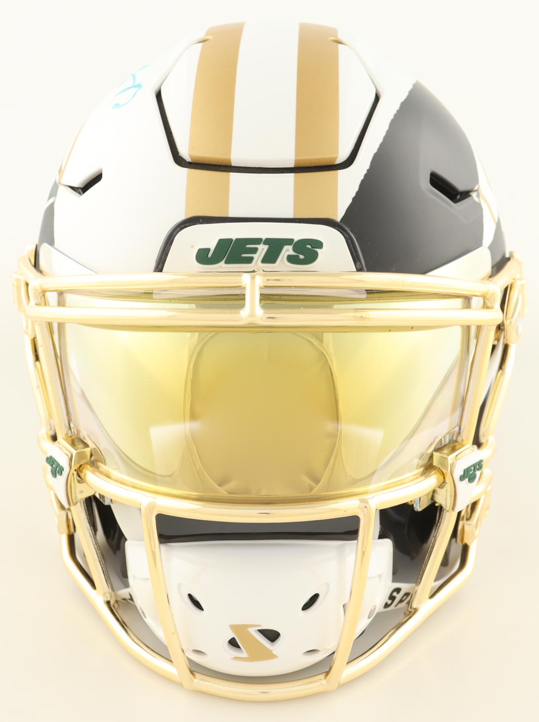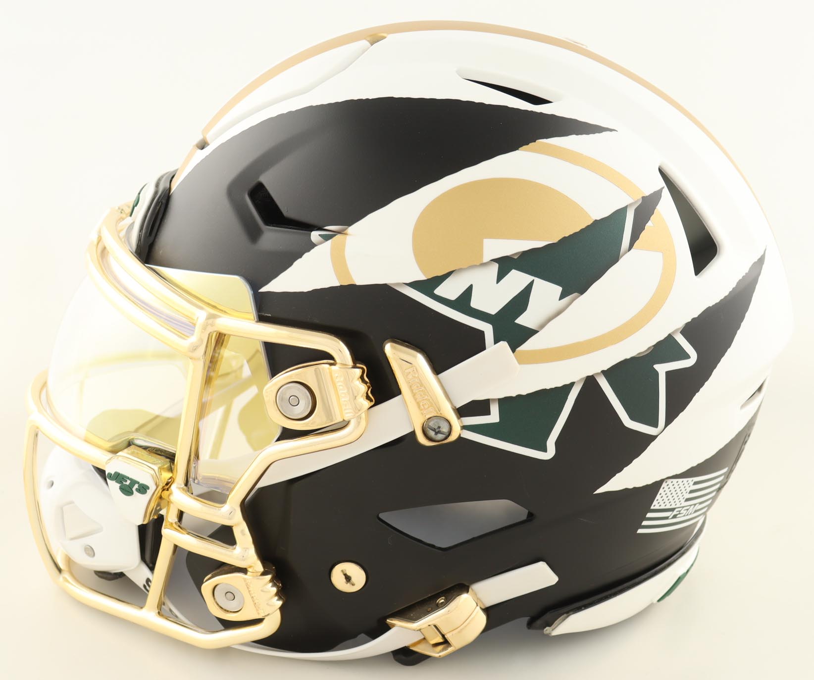 Riddell Green Bay Packers / New York Jets full-size authentic on-field speedflex helmet with a visor. Hand-signed by Aaron Rodgers.