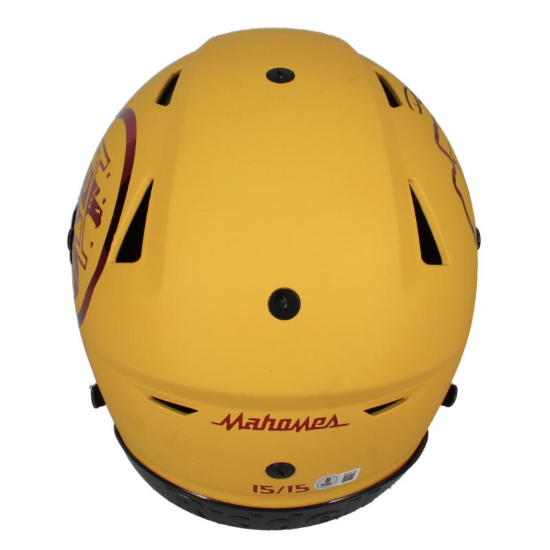 Riddell Kansas City Chiefs full-size authentic on-field custom yellow matte / red chrome inlay speedflex helmet. Hand-signed by Patrick Mahomes. This item is limited edition and has been hand-numbered #15/15.