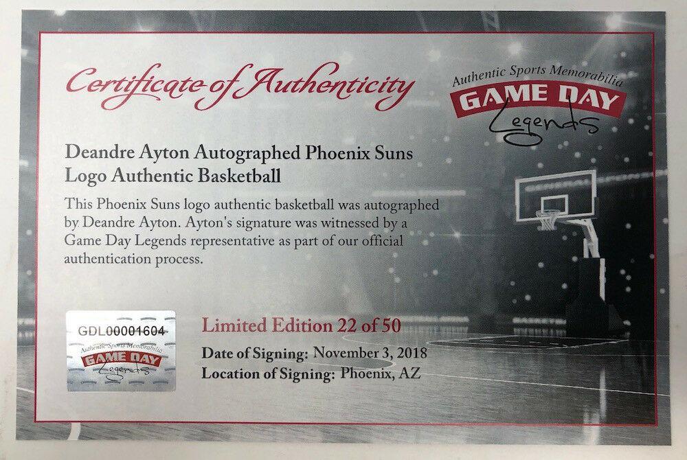 Spalding Phoenix Suns logo basketball has been hand-signed by Deandre Ayton. You will receive number "22" from the limited edition series.