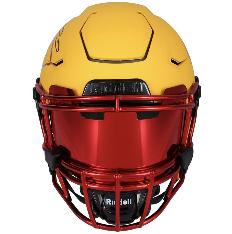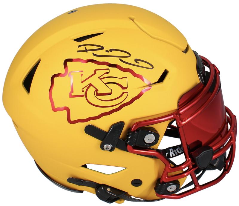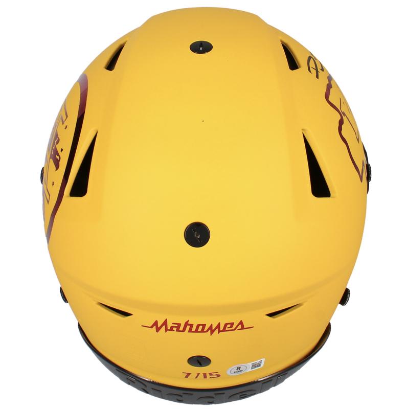 Riddell Kansas City Chiefs full-size authentic on-field custom yellow matte / red chrome inlay speedflex helmet. Hand-signed by Patrick Mahomes. This item is limited edition and has been hand-numbered #/15.