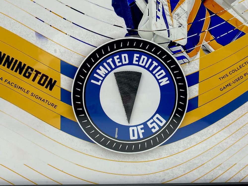 Custom framed display measures 15" x 17" in size and features a game-used hockey puck piece. Display is limited edition #1/50. Please note, the display includes a facsimile autograph of Jordan Binnington (St. Louis Blues).