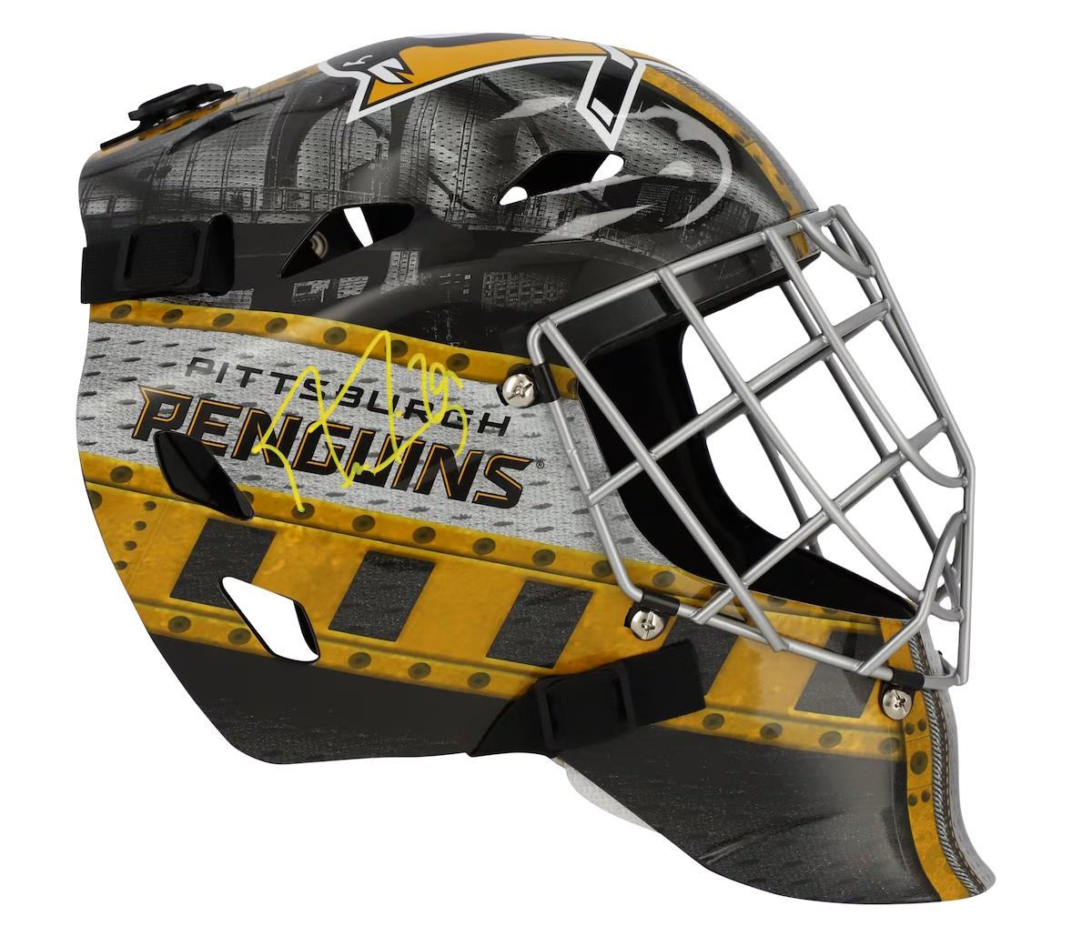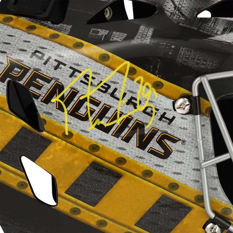 Pittsburgh Penguins full-size replica goalie mask. Hand-signed by Marc-Andre Fleury.