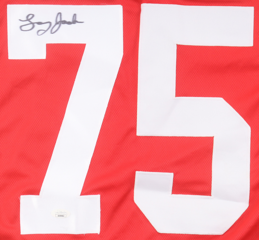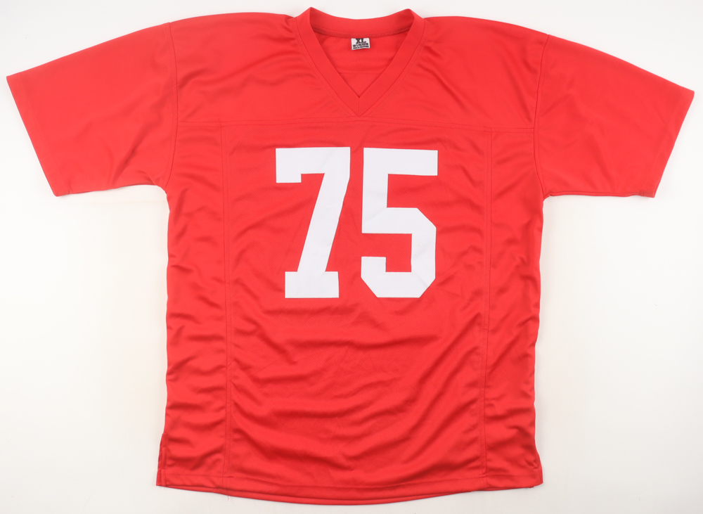 Custom Jersey. Everything sewn on, size XL, has been hand-signed by Larry Jacobson. Please note, the signature has bled.