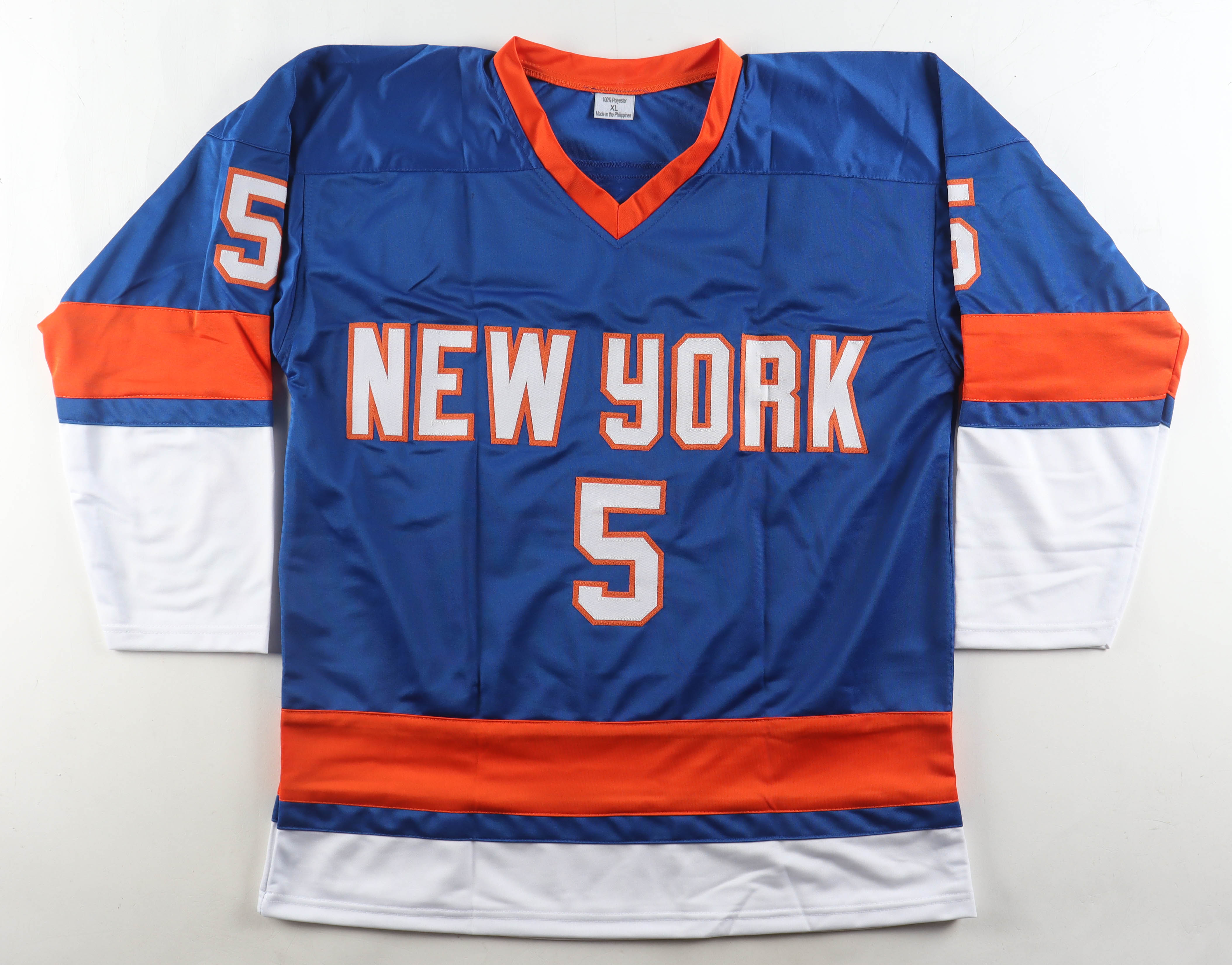 Custom jersey with everything sewn on, size XL. Hand-signed and inscribed by Denis Potvin (New York Islanders, HOF).