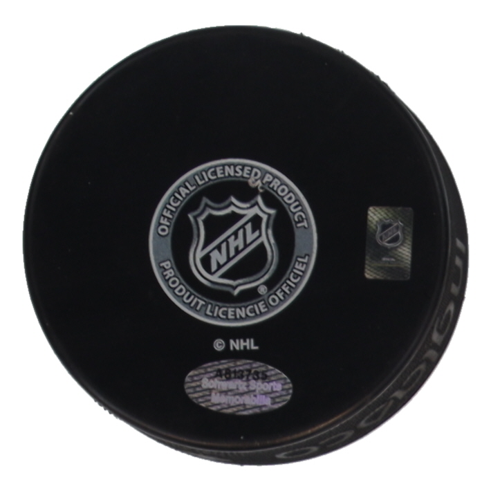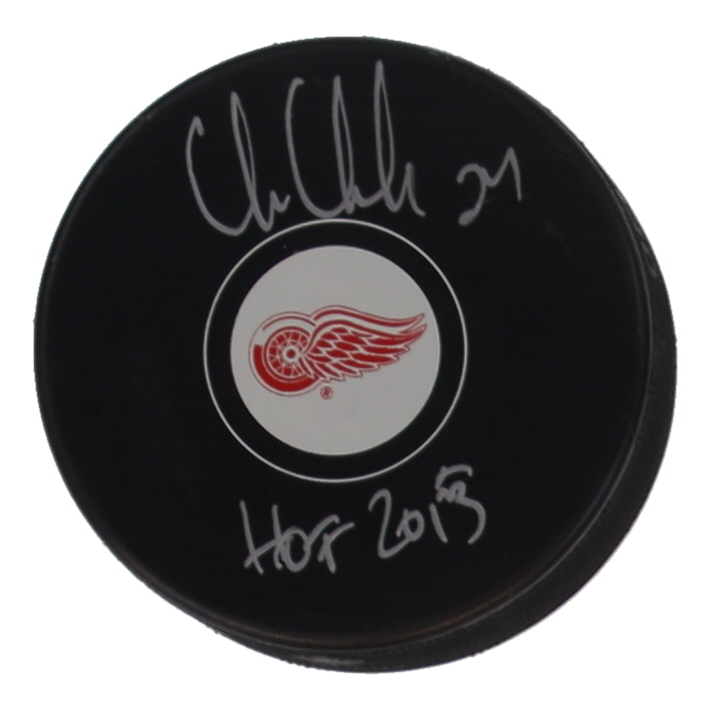Detroit Red Wings Logo Hockey Puck. Hand-signed and inscribed by Chris Chelios (HOF).