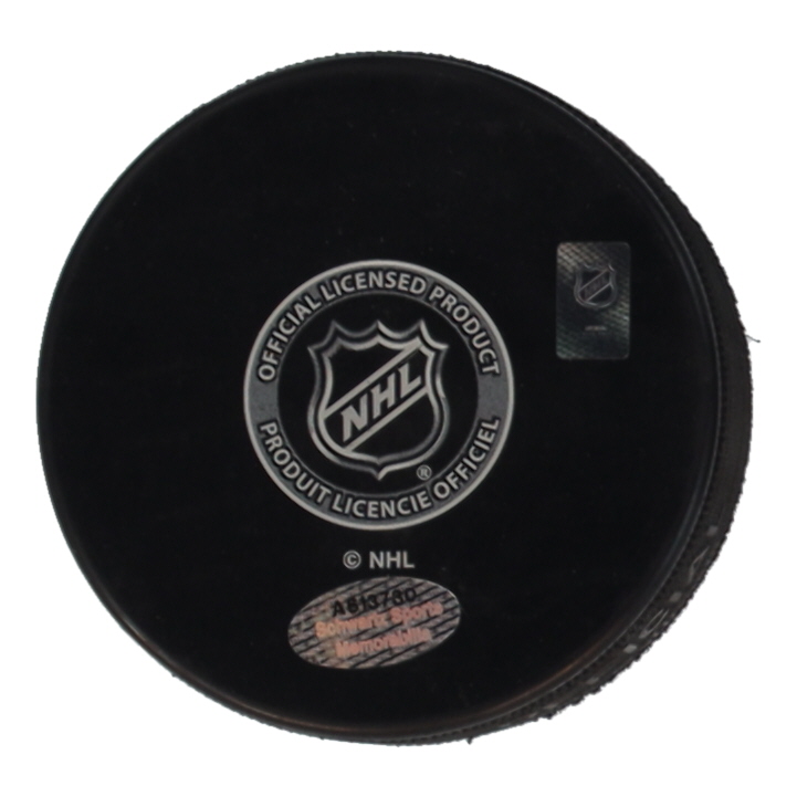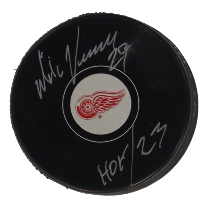 Detroit Red Wings logo hockey puck. Hand-signed by Mike Vernon (HOF). Please note the signature is smudged.