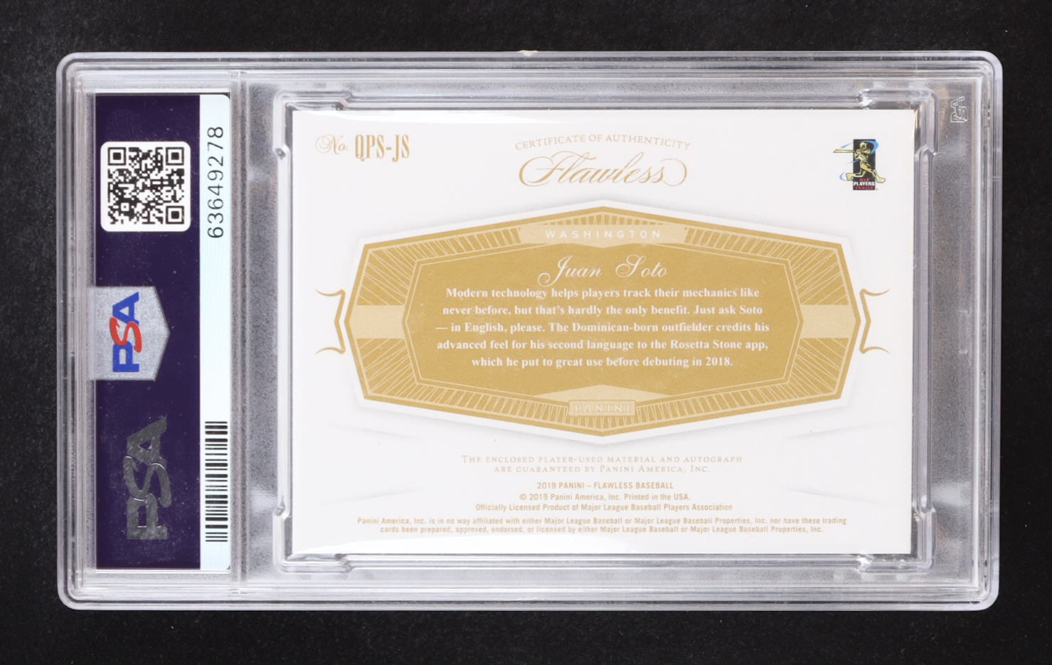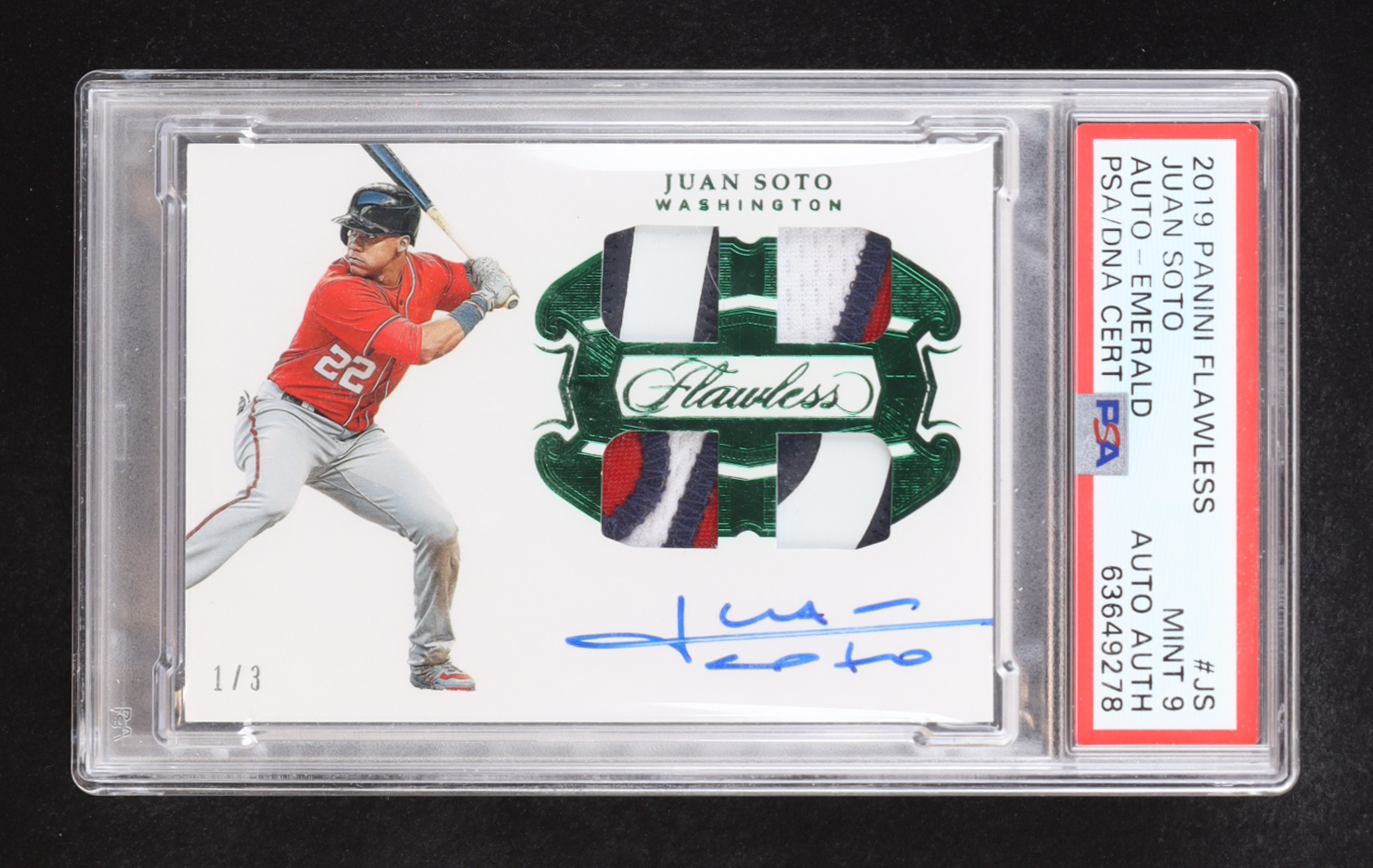 Juan Soto 2019 Panini Flawless Quad Patch Signatures Emerald #3 #1/3 (PSA 9)
