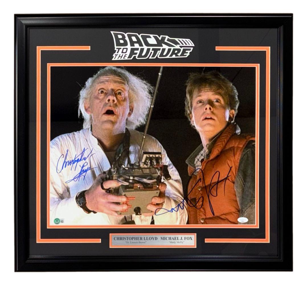 Custom frame measures 24” x 30” in size and features a photo that has been hand-signed by Christopher Lloyd (Doc Brown) and Michael J. Fox (Marty McFly).
