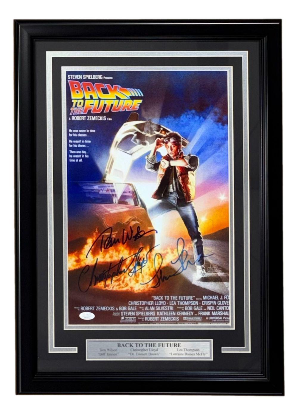 Custom frame measures 16” x 22” in size and features a photo that has been hand-signed by Christopher Lloyd (Doc Brown), Thomas Wilson (Biff Tannen) and Lea Thompson (Lorraine Baines-McFly).