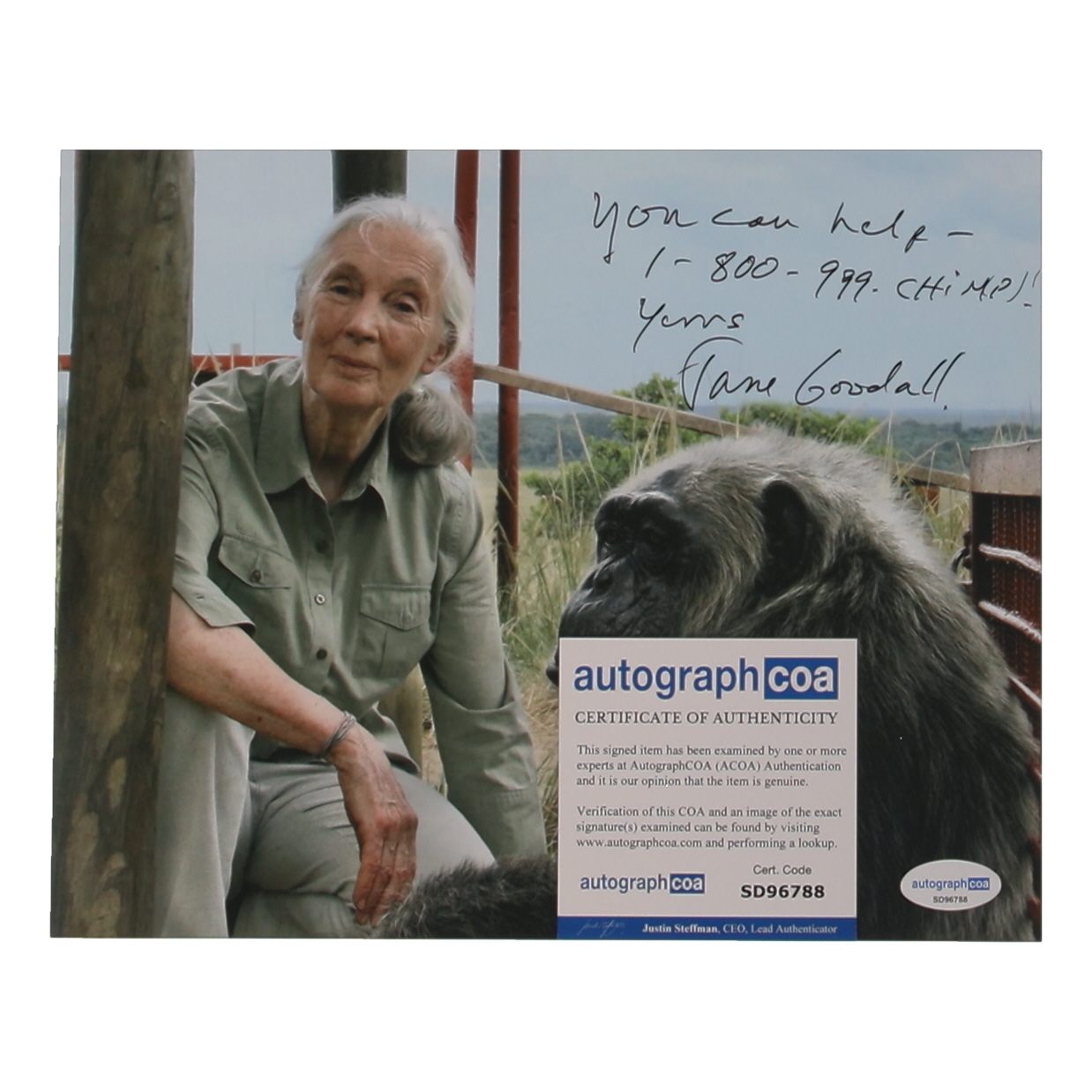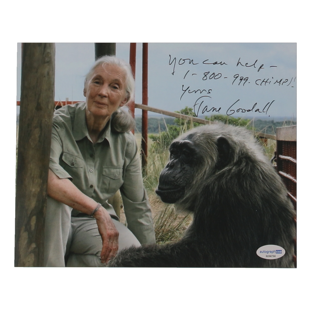 Jane Goodall Signed 8x10 Photo Inscribed "You Can Help - 1-800-999-Chimps!" & "Yours" (ACOA)