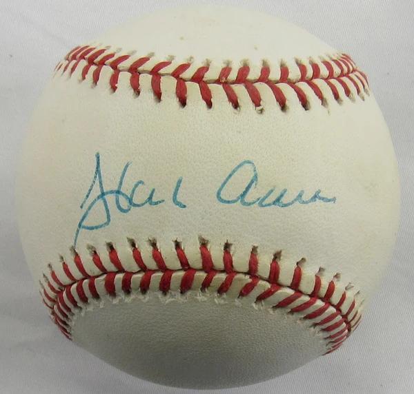 Rawlings Official National League Baseball. Hand-signed by Hank Aaron (D. 2021, Atlanta Braves, HOF). Please note, the baseball is naturally toning and stained.