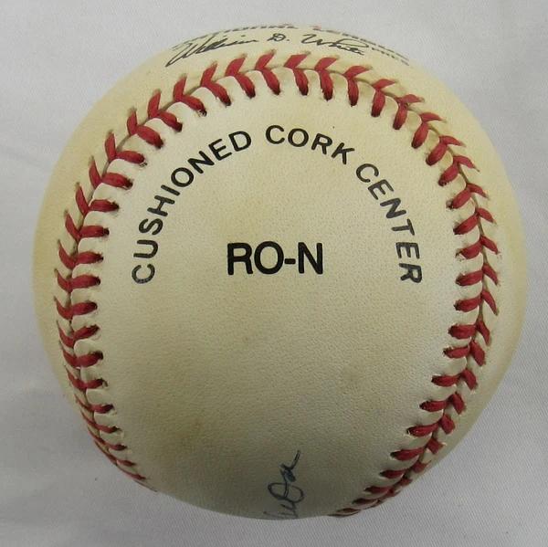 Rawlings Official National League Baseball. Hand-signed by Hank Aaron (D. 2021, Atlanta Braves, HOF). Please note, the baseball is naturally toning and stained.