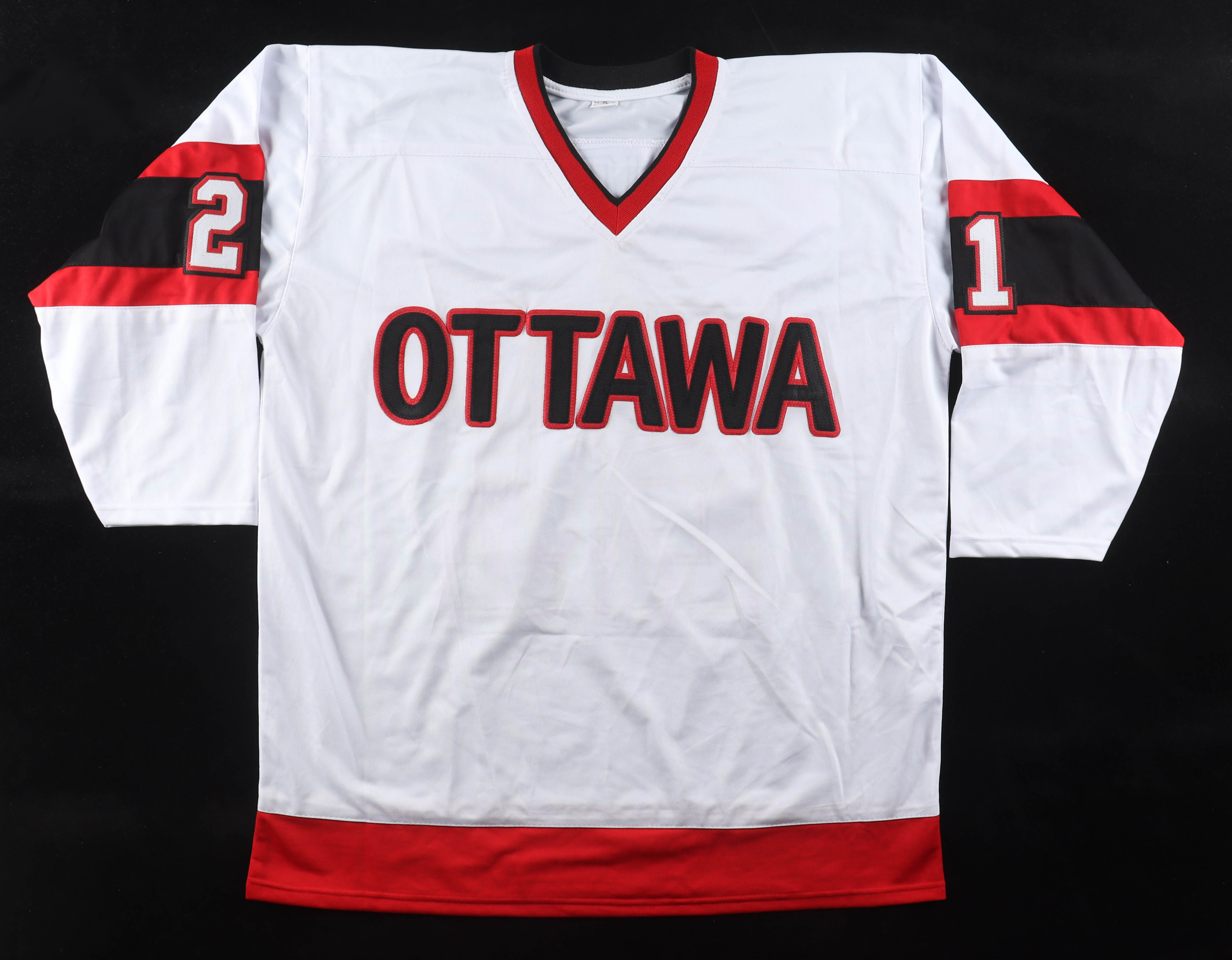 Custom jersey with everything sewn on, size XL. Hand-signed and inscribed by Nick Cousins (Ottowa Senators). Please note, the back of the jersey is stained.