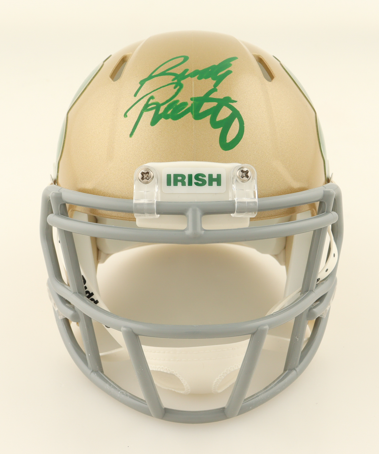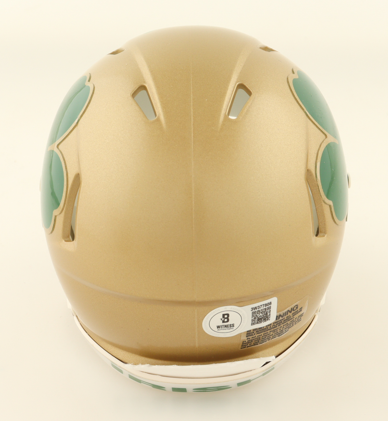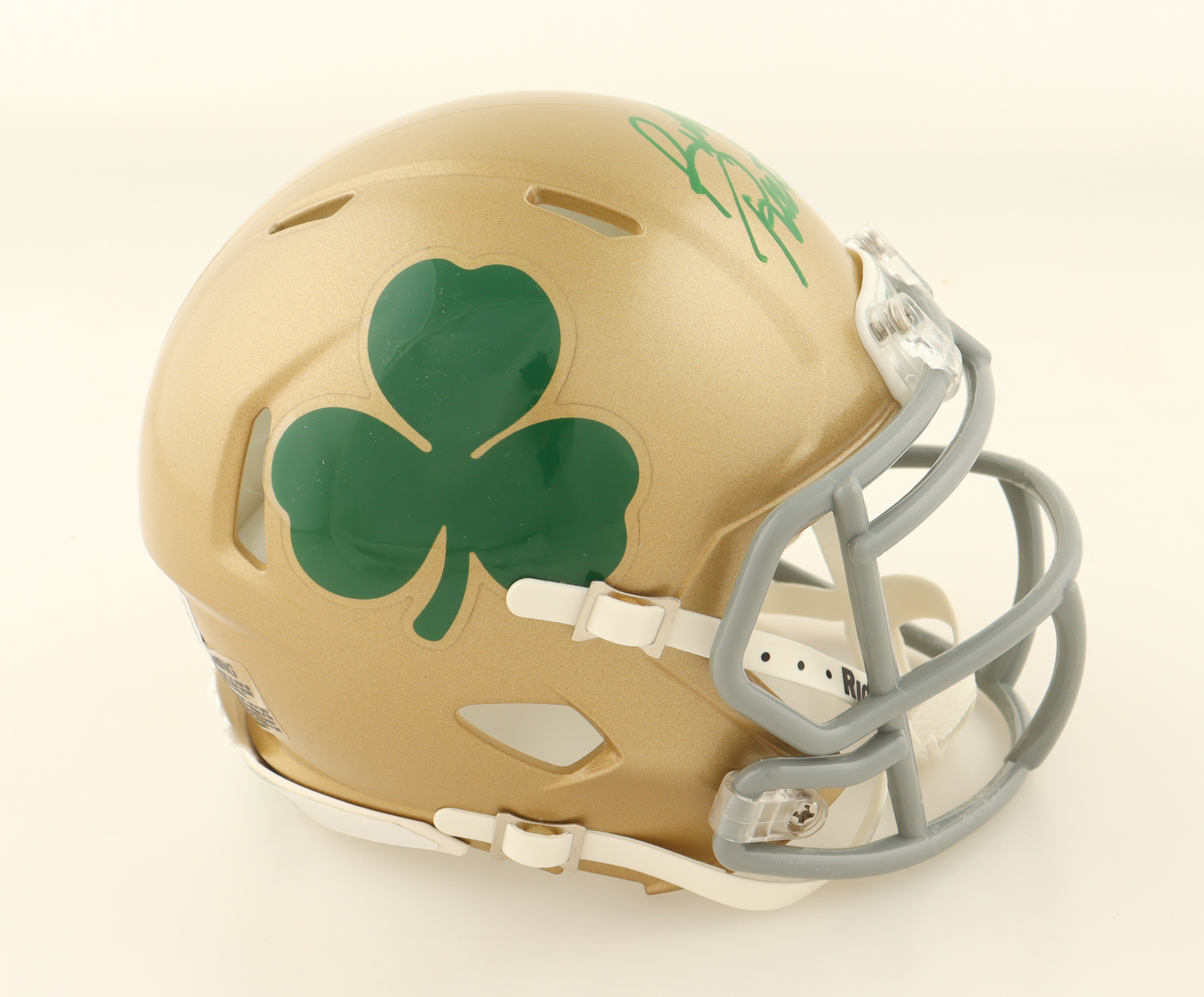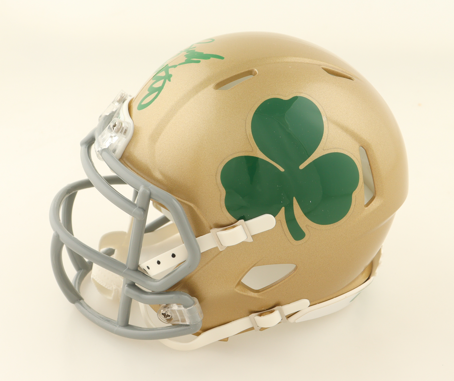 Riddell Notre Dame Fighting Irish speed mini helmet has been hand-signed by Rudy Ruettiger.