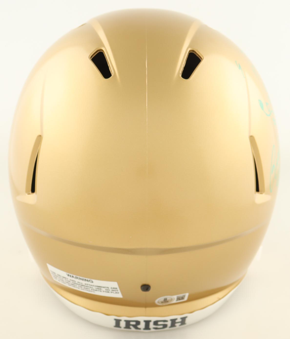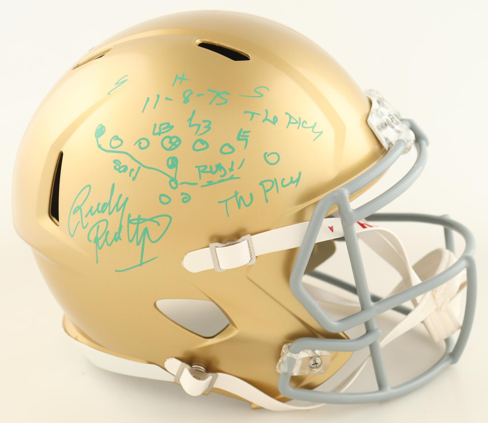 Riddell Notre Dame Fighting Irish full-size replica speed helmet has been hand-signed and inscribed by Rudy Ruettiger.