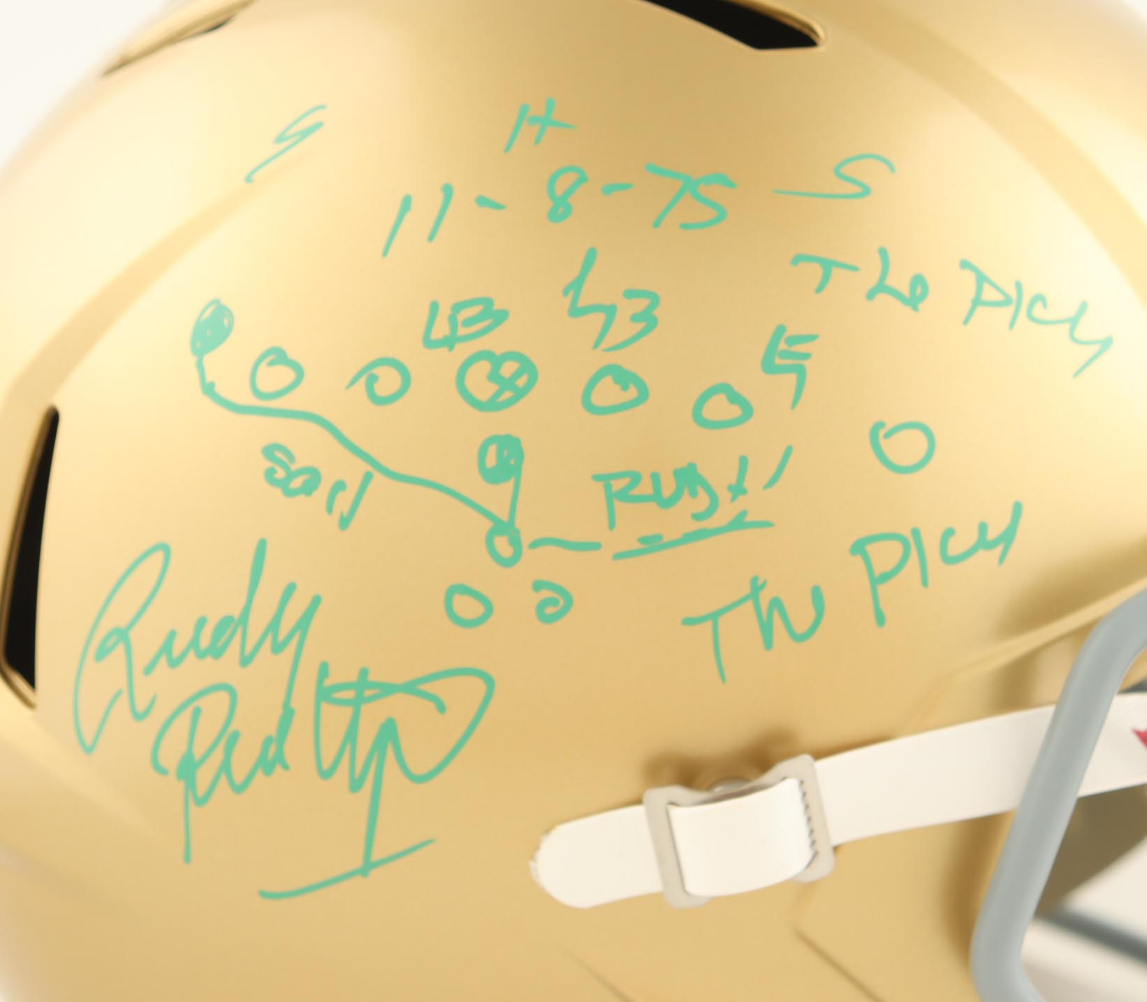 Rudy Ruettiger Signed Notre Dame Fighting Irish Full-Size Speed Helmet Inscribed "The Play" with Hand-Drawn Sketch (Beckett)