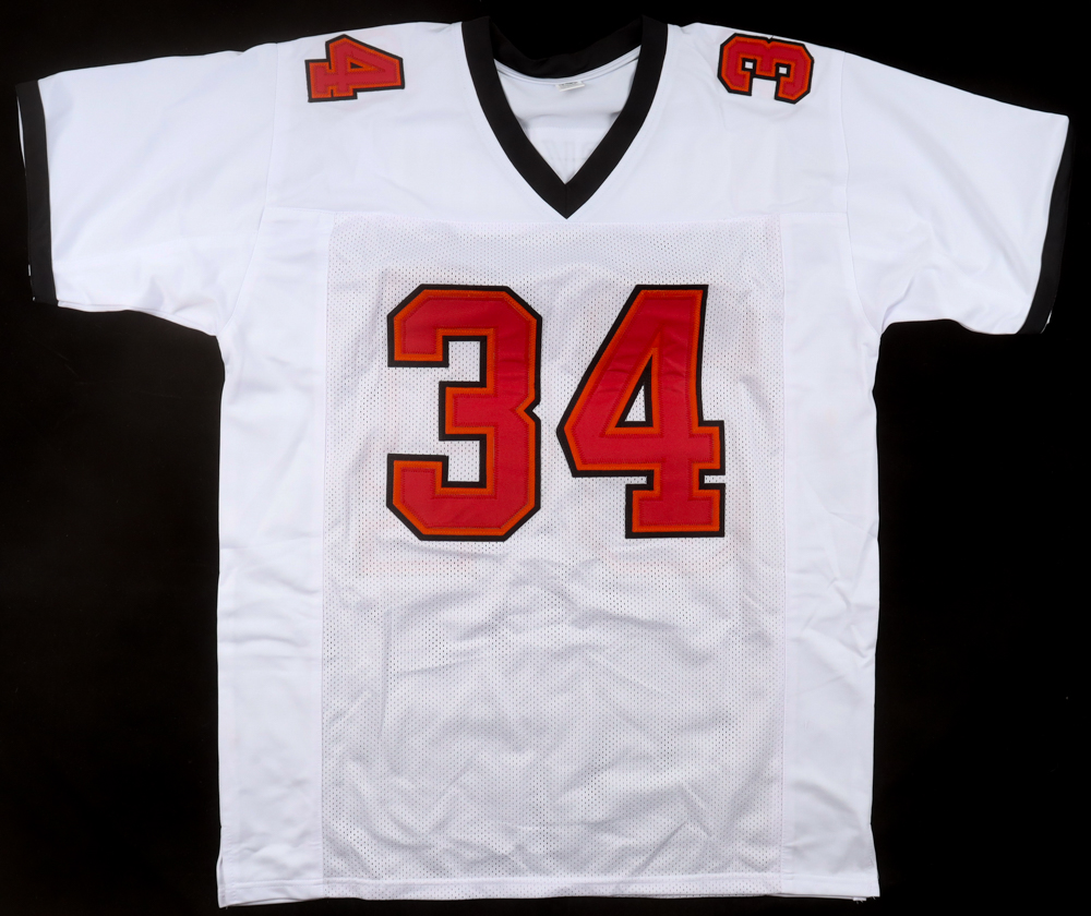 Custom jersey with everything sewn on, size XL. Hand-signed and inscribed by Dexter Jackson (Tampa Bay Buccaneers).