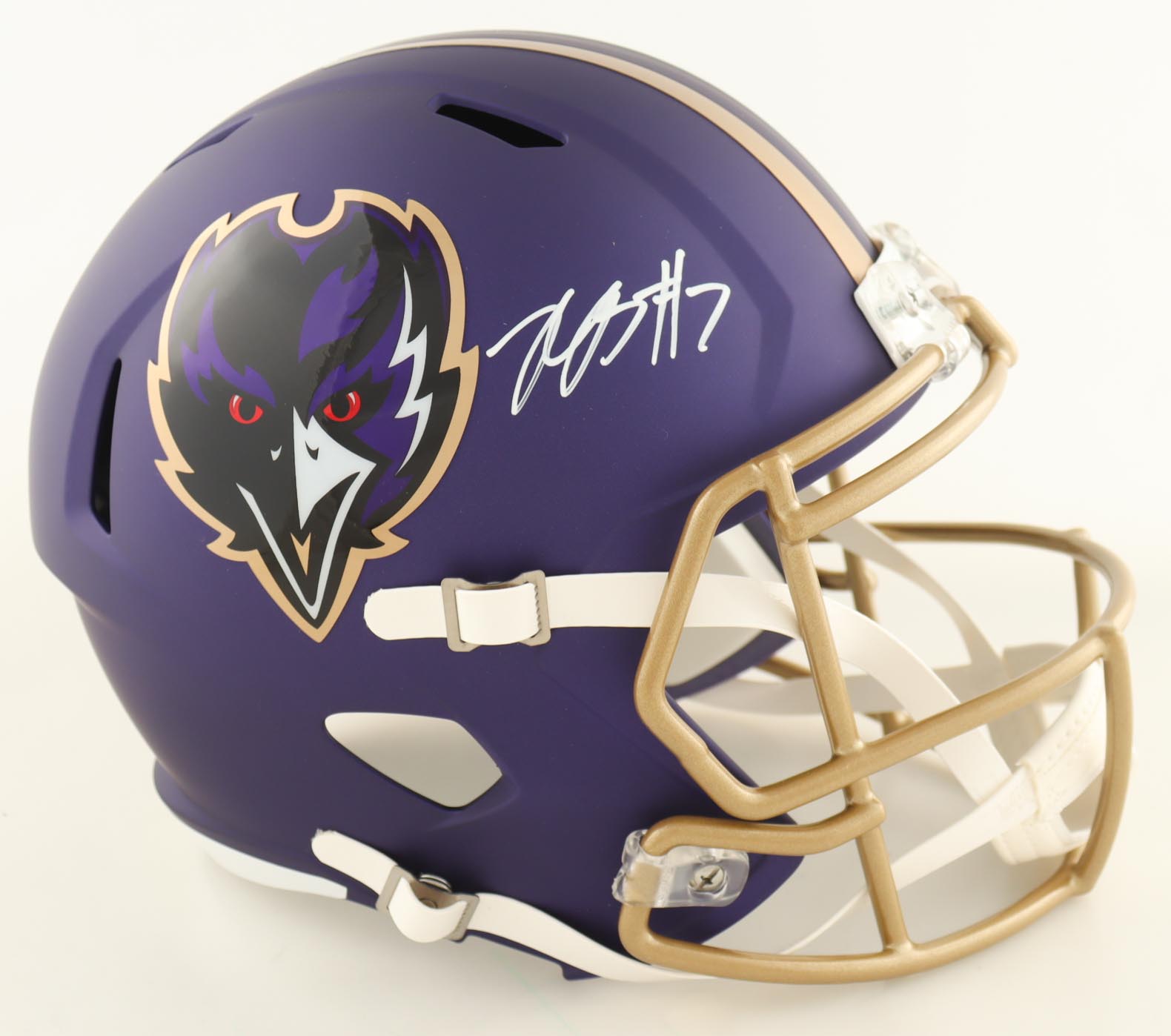 Riddell Baltimore Ravens full-size replica flash alternate speed helmet. Hand-signed by Rashod Bateman.