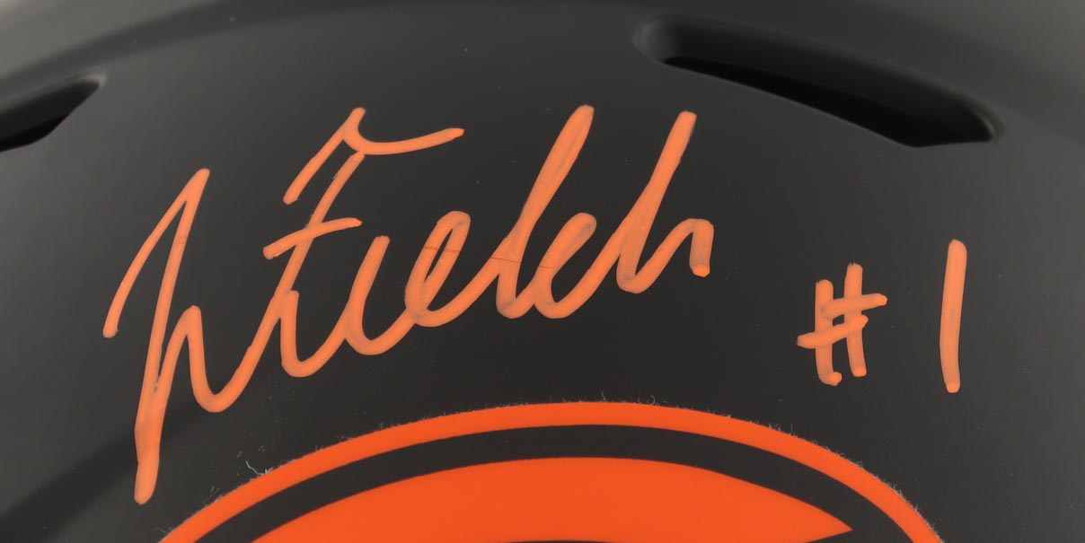 Riddell Chicago Bears full-size authentic, on-field Eclipse Alternate speed helmet. Hand-signed by Justin Fields.