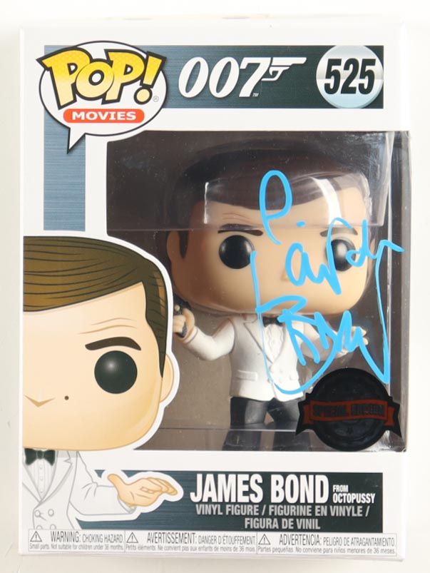 Vinyl figure measures approximately 4" tall and has been hand-signed by Pierce Brosnan. Please note, item has been window-swapped.