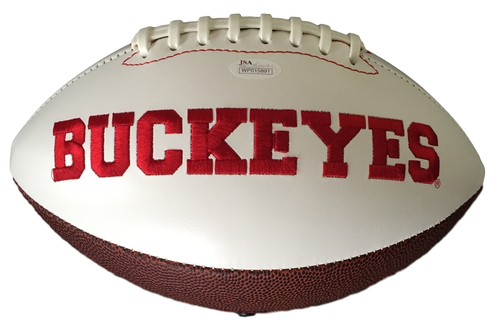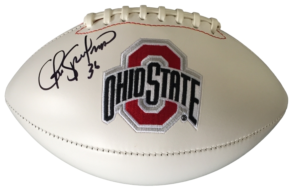 Ohio State Buckeyes full-size logo football. Hand-signed in black felt-tip pen by Chris Spielman (Lions).