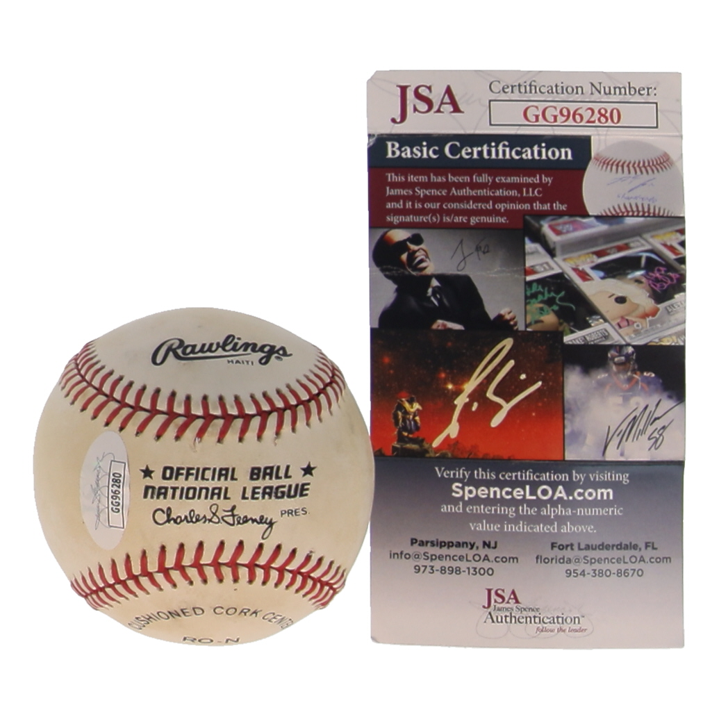 Rawlings Official National League Baseball. Hand-signed and inscribed by Jim Kaat (San Fransisco Giants). Please note, the baseball is naturally toned and has staining.