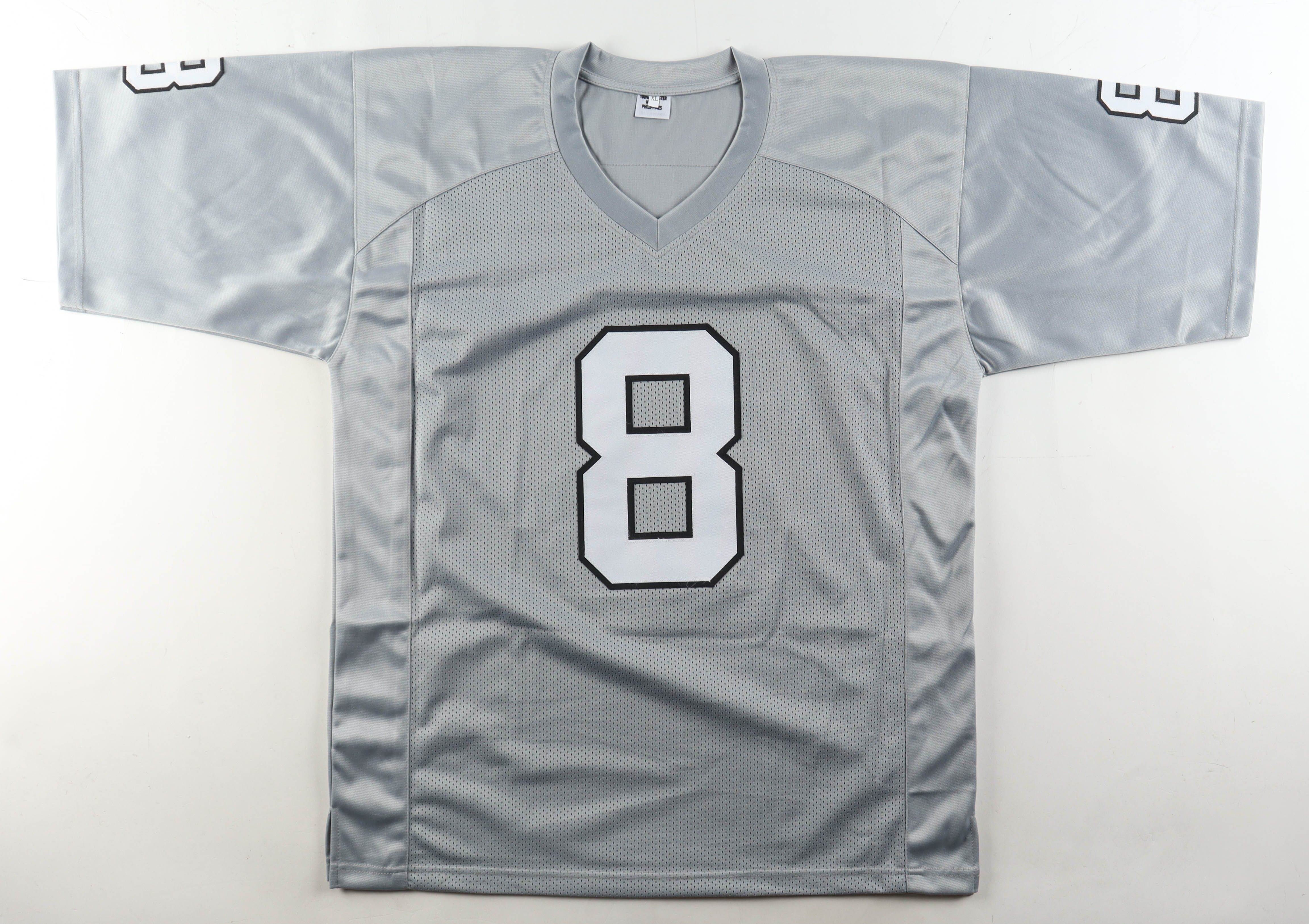 Custom jersey with everything sewn on, size XL. Hand-signed and inscribed by Ray Guy (D. 2022, HOF).