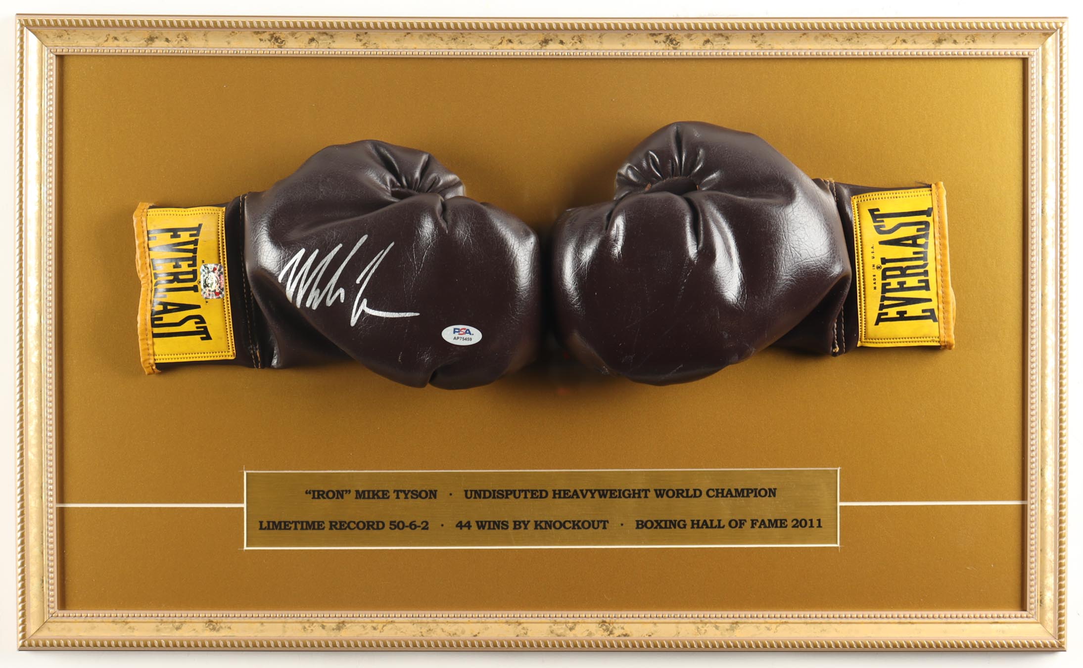 Mike Tyson Signed Custom Framed Set of (2) Vintage Everlast Boxing Gloves Display with Stat Plaque (Tyson & PSA)