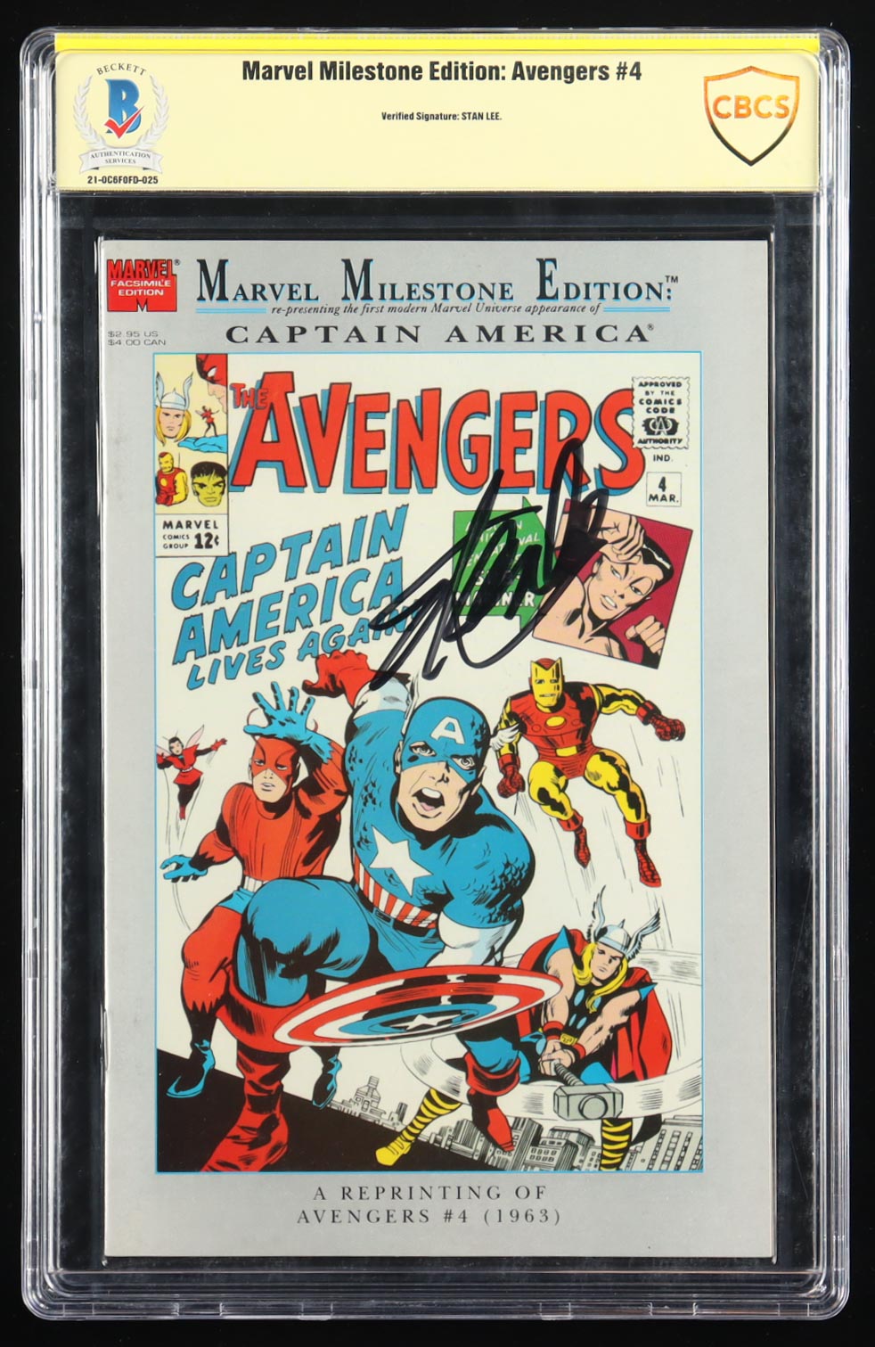 "Marvel Milestone Edition: Avengers" #4 has been hand-signed by Stan Lee (D. 2018) and is authenticated (CBCS). Please see photos for details regarding the condition of the comic.