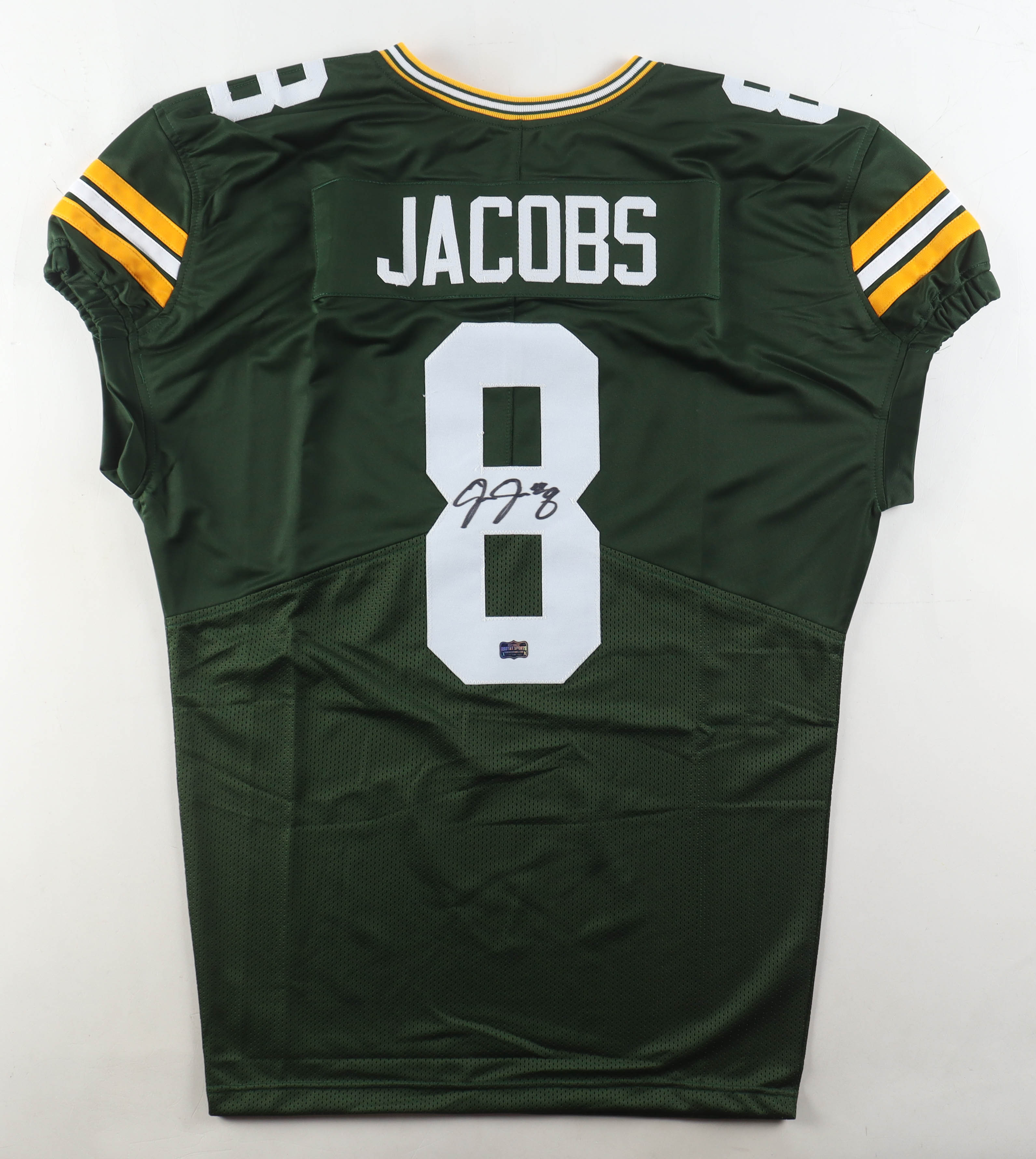 Custom jersey with everything sewn on, size XL. Hand-signed by Josh Jacobs.
